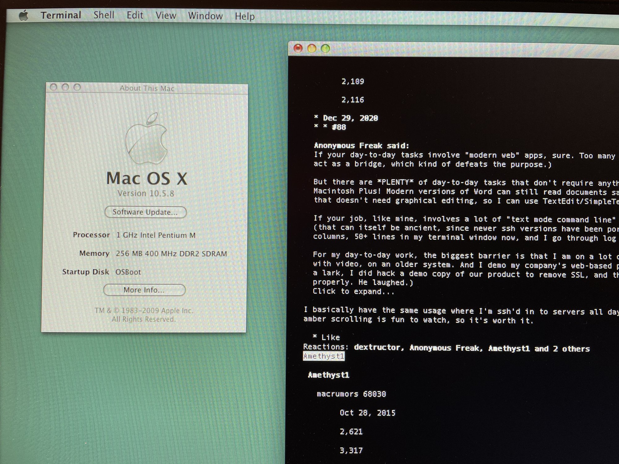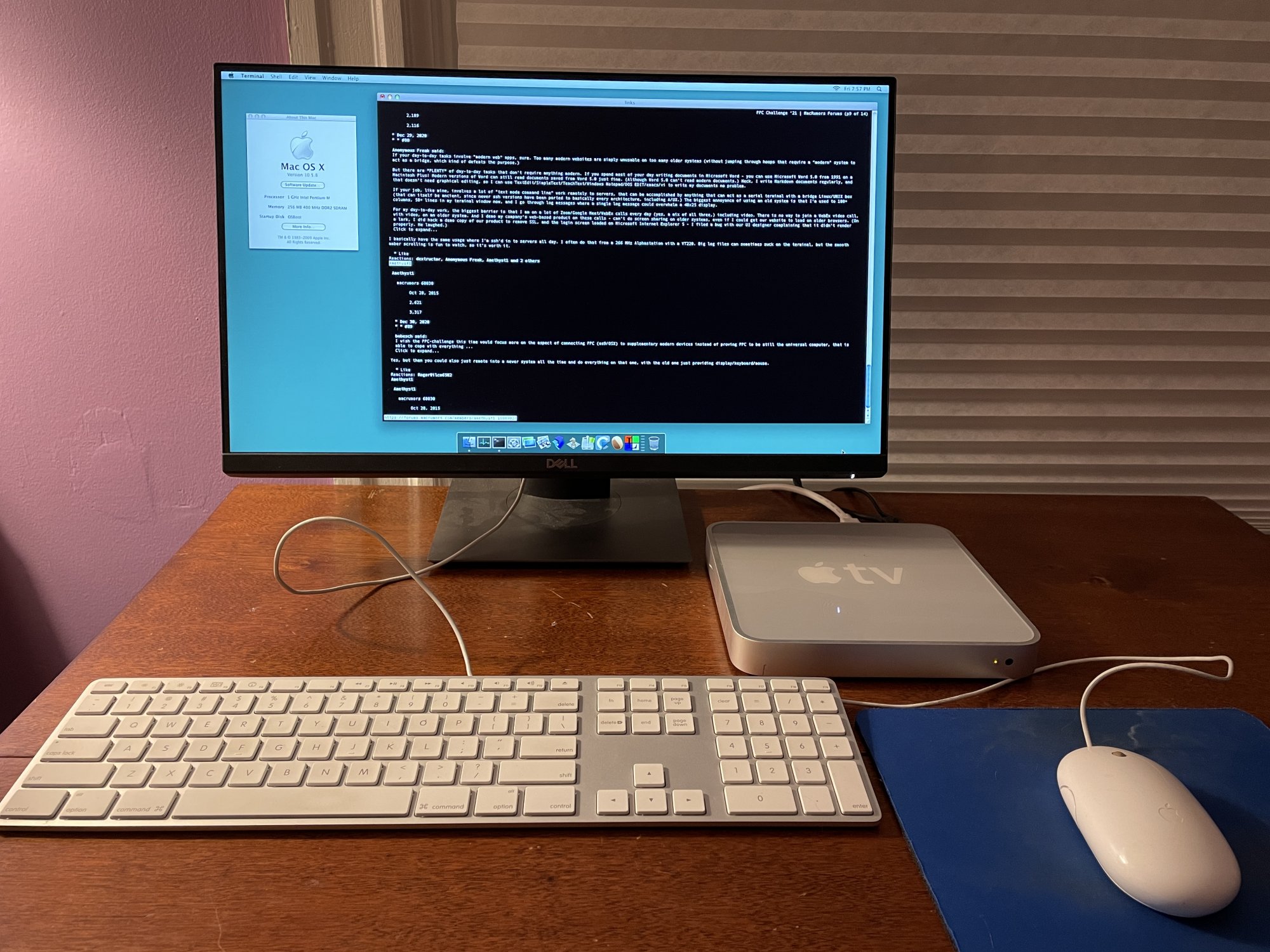 Well, it's not a PPC Mac, but it's their next closest neighbor: the slowest Intel Mac ever made. That's right, it's a first-generation AppleTV! I have mine on 10.5.8, so it has similar software limitations to a PPC Mac. However, the 256 MB RAM (soldered to the motherboard) really hobbles the machine and makes it almost unusable. Almost.