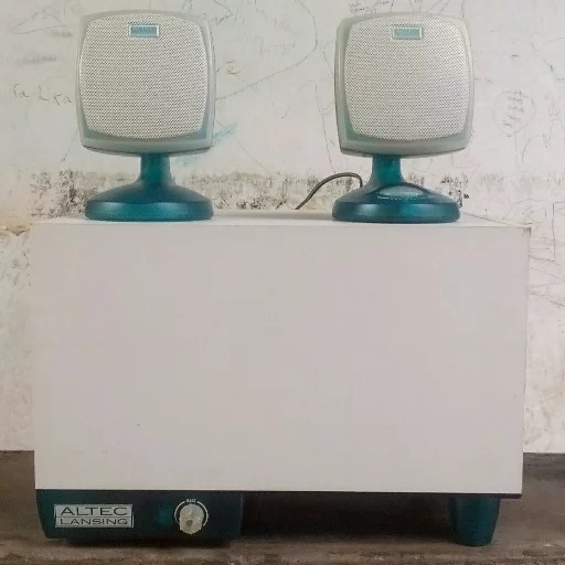 I recently managed to acquire the Cozo speakers that I mentioned above– I'd wanted one in blueberry, but got Bondi Blue, and must say it's very nice. They really paid attention to detail with their ones, perfectly matching the angle of the iMac's side profile on their own, to create a sort of "mini iMac", as shown in this promotional image: