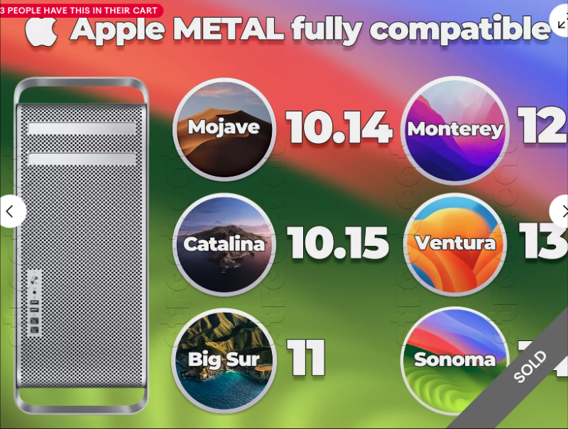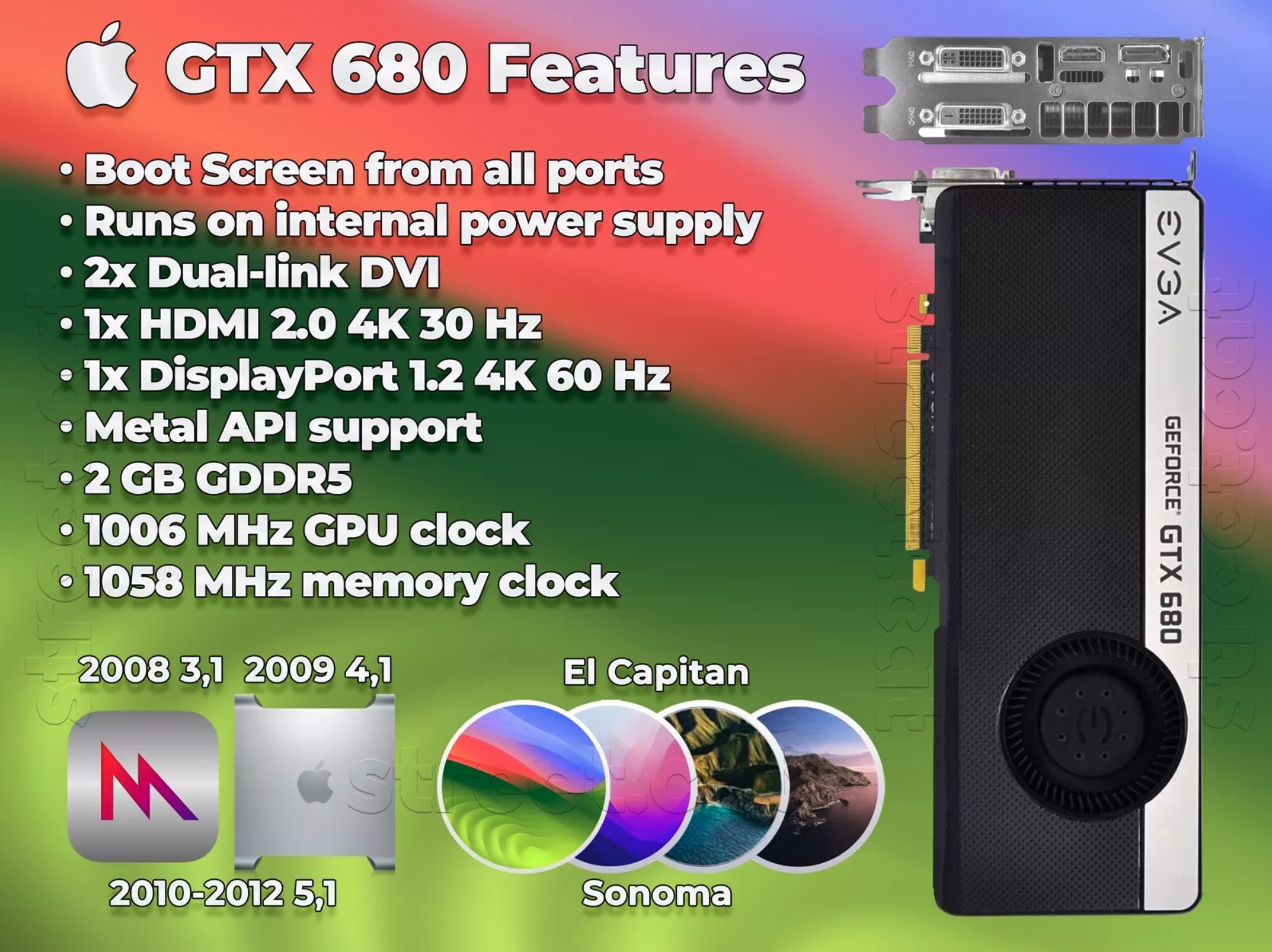 Apple EFI Boot Screen, Metal Support, 4K Output, macOS 10.14 Mojave, macOS 10.15 Catalina, macOS 11 Big Sur, macOS 12 Monterey, macOS 13 Ventura, macOS 14 Sonoma, Mac Pro 2008 3,1, Mac Pro 2009 4,1, Mac Pro 2010 5,1, Mac Pro 2012 5,1, NVIDIA Kepler, GT 630, GTX 680, GTX 780, GTX Titan, MacVidCards MVC Compatible
