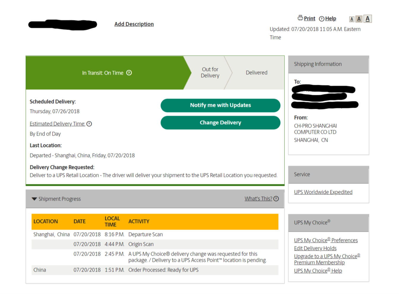 China 07/18/2018 5:59 P.M. Order Processed: Ready for UPS