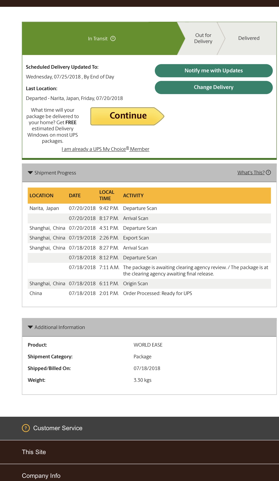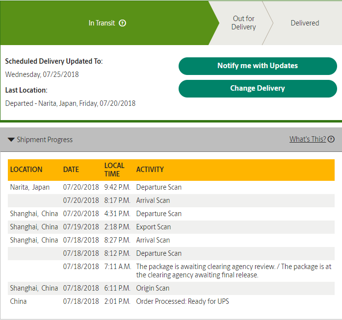Anchorage, AK, United States 07/19/2018 5:49 P.M. A mechanical failure has caused a delay. We will update the delivery date as soon as possible. / Your delivery has been rescheduled for the next business day.
