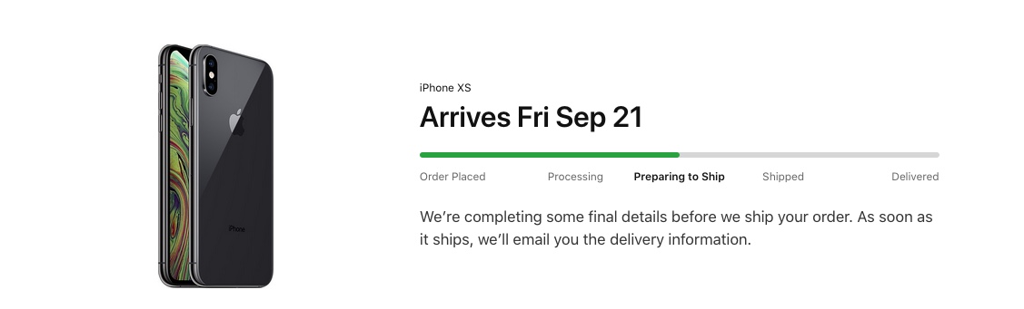 I’ve got preparing to ship too on my iPhone Xs 256 GB Silver ATT purchased using Apple’s 24 month 0% financing. My AW S4 is still “order in progresss.”