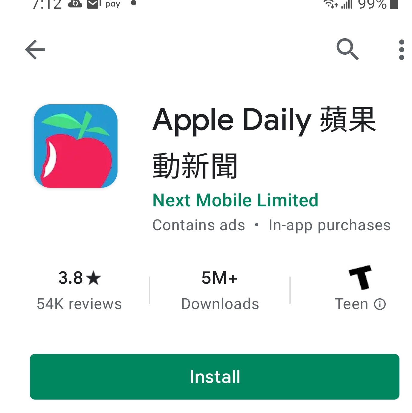 There is an apple logo on an app in the Google play store that I saw when I was seeing what comes up there when I search for Apple News. I think it belongs to a Hong Kong based company. It even has a bite taken out. The app is called Apple Daily. How did Apple's lawyers miss this? It even comes up as a result of searching for Apple News.