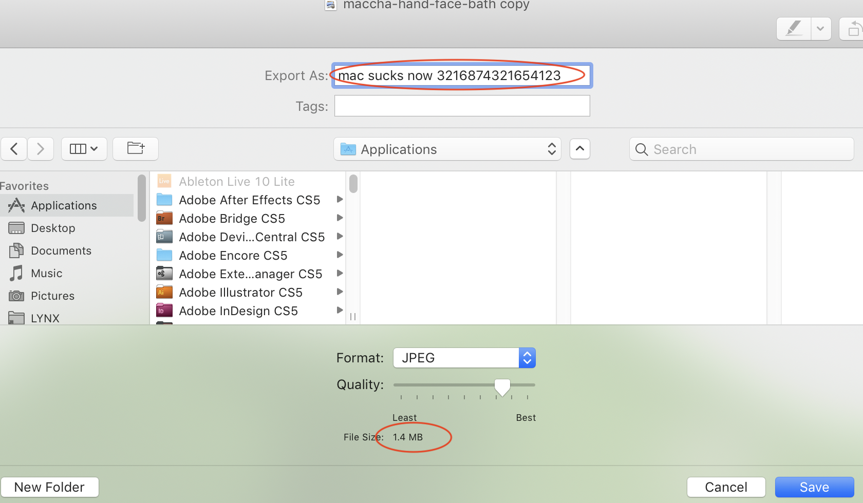 I change it and save it with a new name, "Mac sucks now" followed by a random series of digits just to show you I'm not making this up.