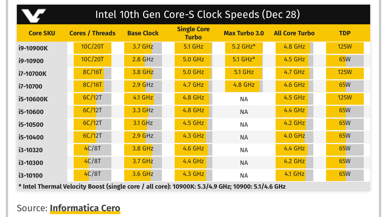 There are a ton of 65W S-series, three each of 4/8 and 6/12, as well as an 8/16 and a 10/20. Who knows if this is the final lineup though. For instance the 10/20 is rumored to be 2.5GHz not 2.8GHz but were those the best binnings? Who knows until Intel officially announces.