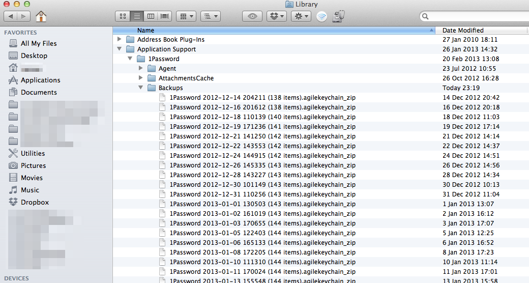 The database is stored in the file 1Password.agilekeychain, backups are normally stored in User>Library>Application Support>1Password>Backups