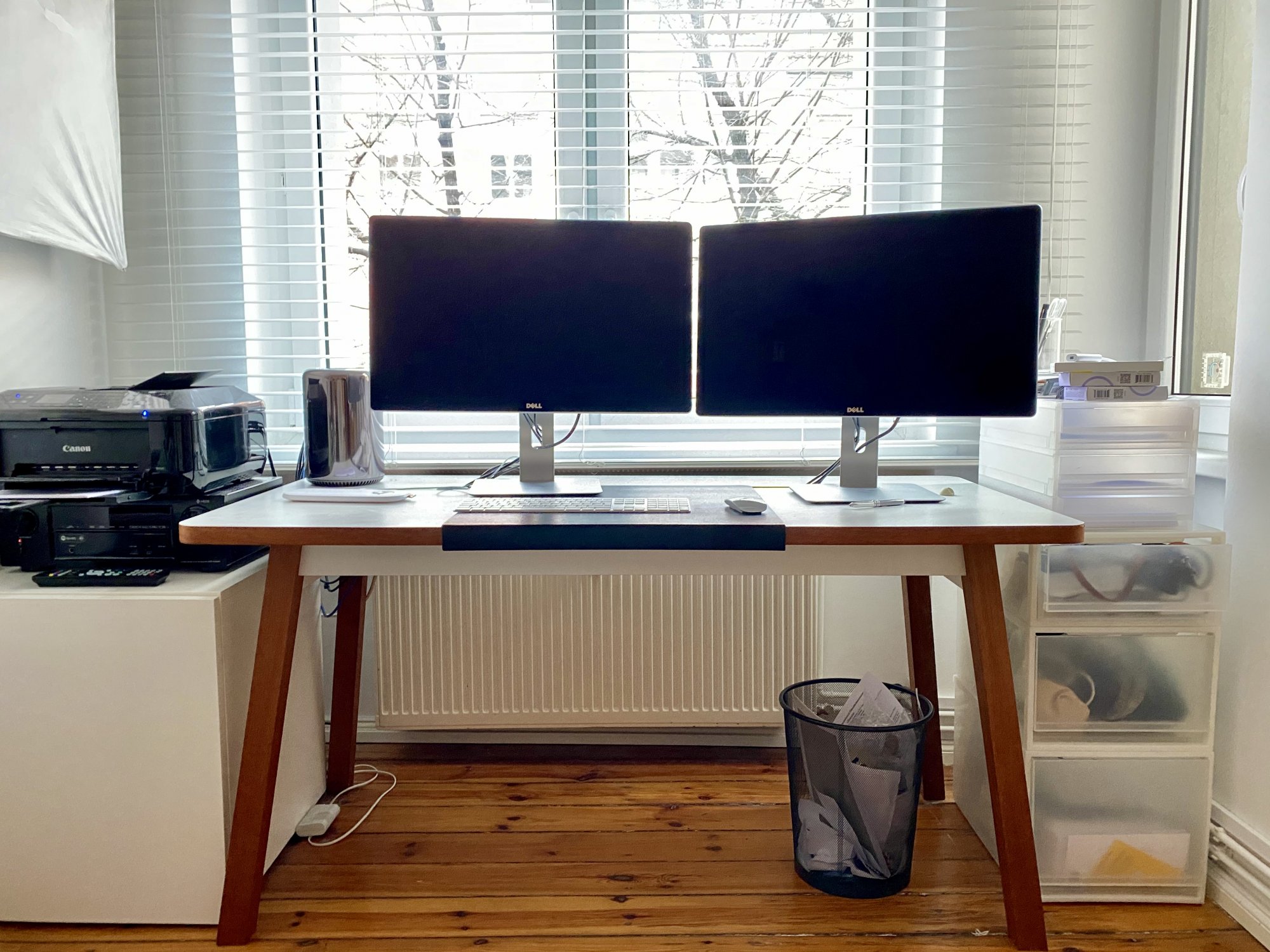 currently my desk looks like this (except for the trashcan gone and replaced by the cheese grater).