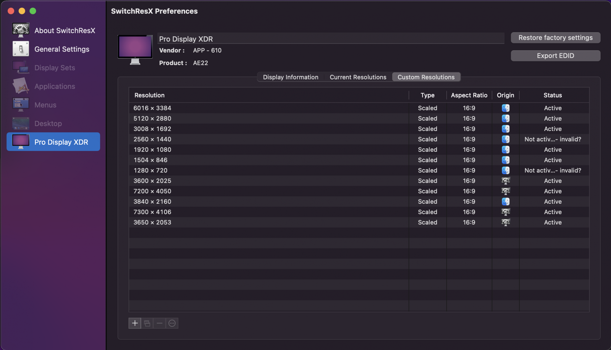 Fast forward to receiving my absolutely maxed out MacBook Pro M1 Max and the situation isn't as elegant. It turns out that the new M1 Max Graphics system, although able to drive 3 of these amazing XDR displays, is limited to its max scaled resolution that it will drive. I did some research and it turns out that the late Intel MBPs could address a display up to 65,536 pixels wide as a scaled resolution. Unfortunately the the M1 Max (unsure about the others) are only able to address something much less than that. Turns out that it can not run the 7720 pixels wide required as a scaled resolution to drive my XDR display at 3840x2160 HiDPI. Therefor the option is simply unavailable in SwitchRes X.
