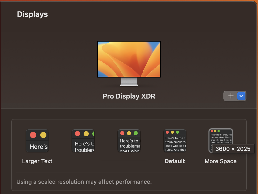 To summarize that post, I was upgrading to the XDR from my trusty 27" LG UltraFine 5K displays which to my surprise had more usable UI screen real estate of 3200 x 1600 as compared to the 32" Pro Display XDR's usable UI real estate of 3008 x 1692. The reason is basically how Apple handles their HiDPI modes where the 5K display in "more space" mode used a <2x pixel doubling ratio and the Pro Display XDR used a proper 2x Pixel Double. Now that may be Apple's opinion of a perfect display but IMO it's just not enough UI real estate for a 32" display which I believe should be 4K (3840x2160).