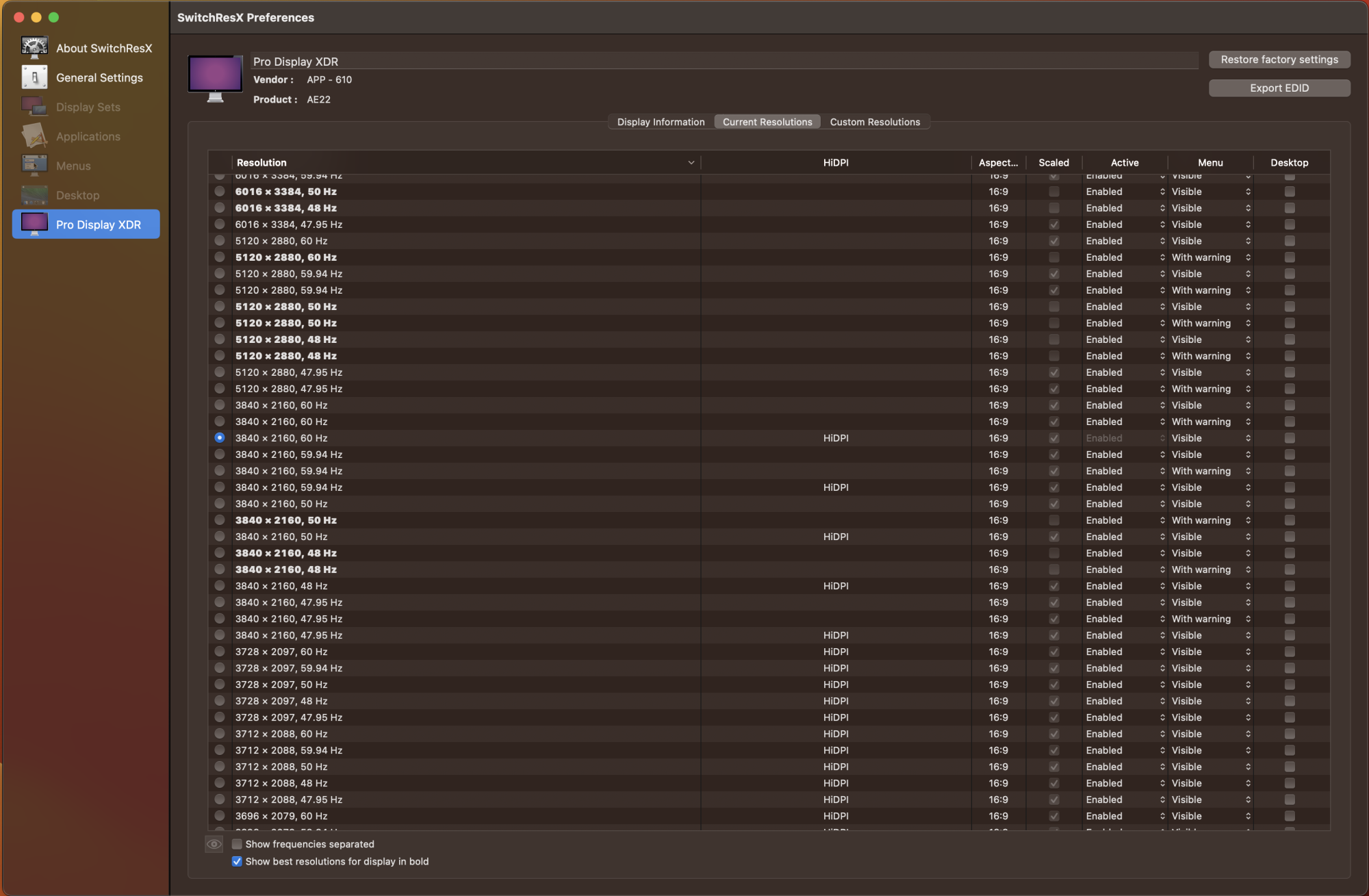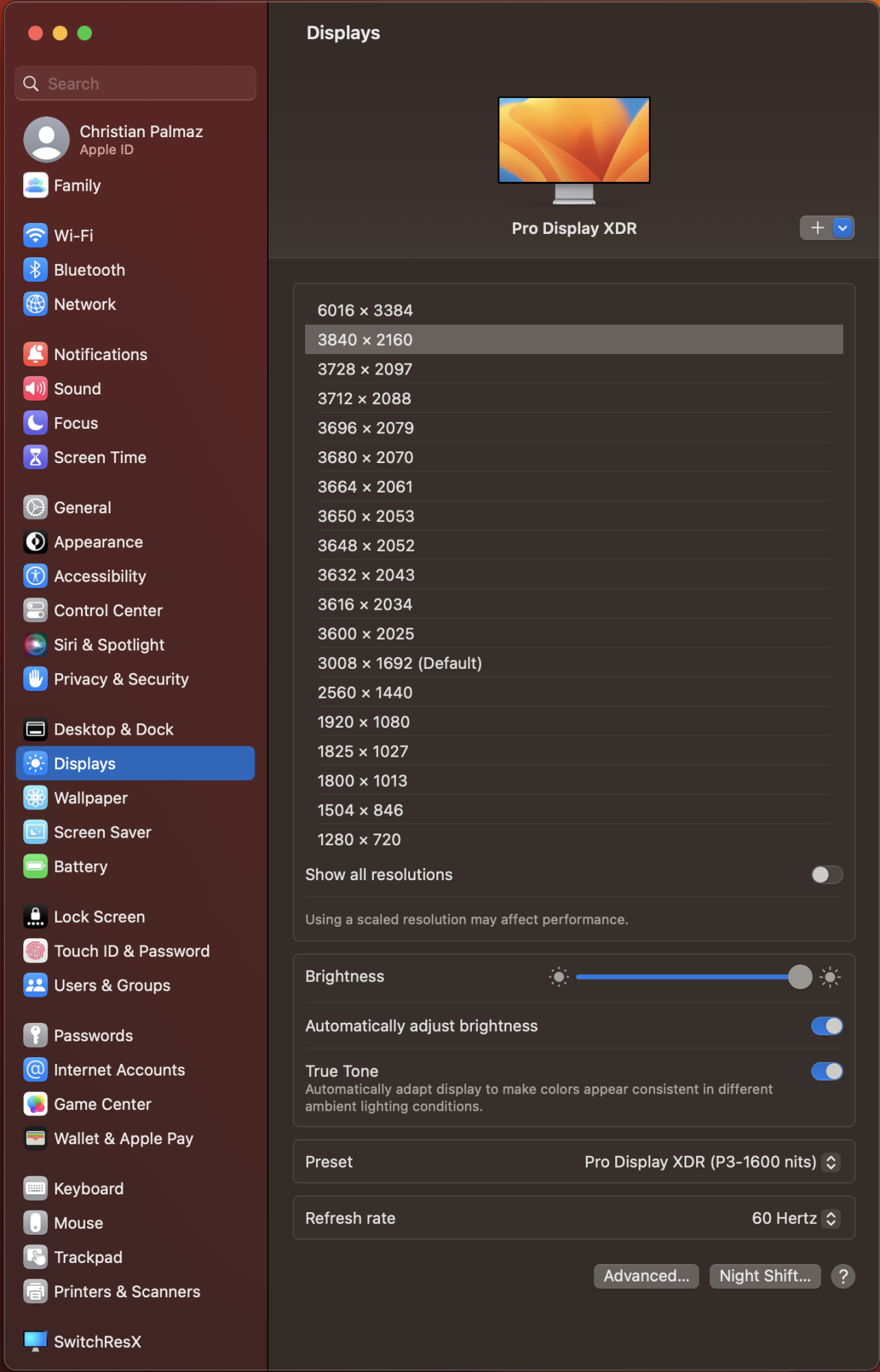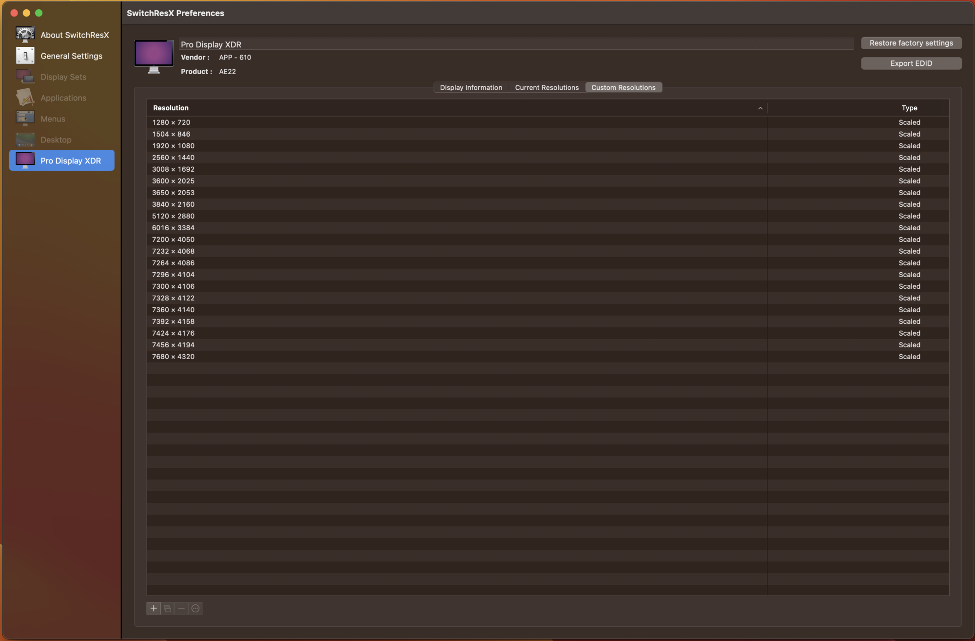 Now never fear because I solved that problem using a WONDERFUL app I was happy to pay for called SwitchRes X (which is Apple Silicon optimized, YEA!). With my intel MBP I was able to simply turn on a custom resolution of 4K HiDPI mode with the XDR which forced the Mac to render 3840x2160 in HiDPI mode on the 6K display which looked marvelous.
