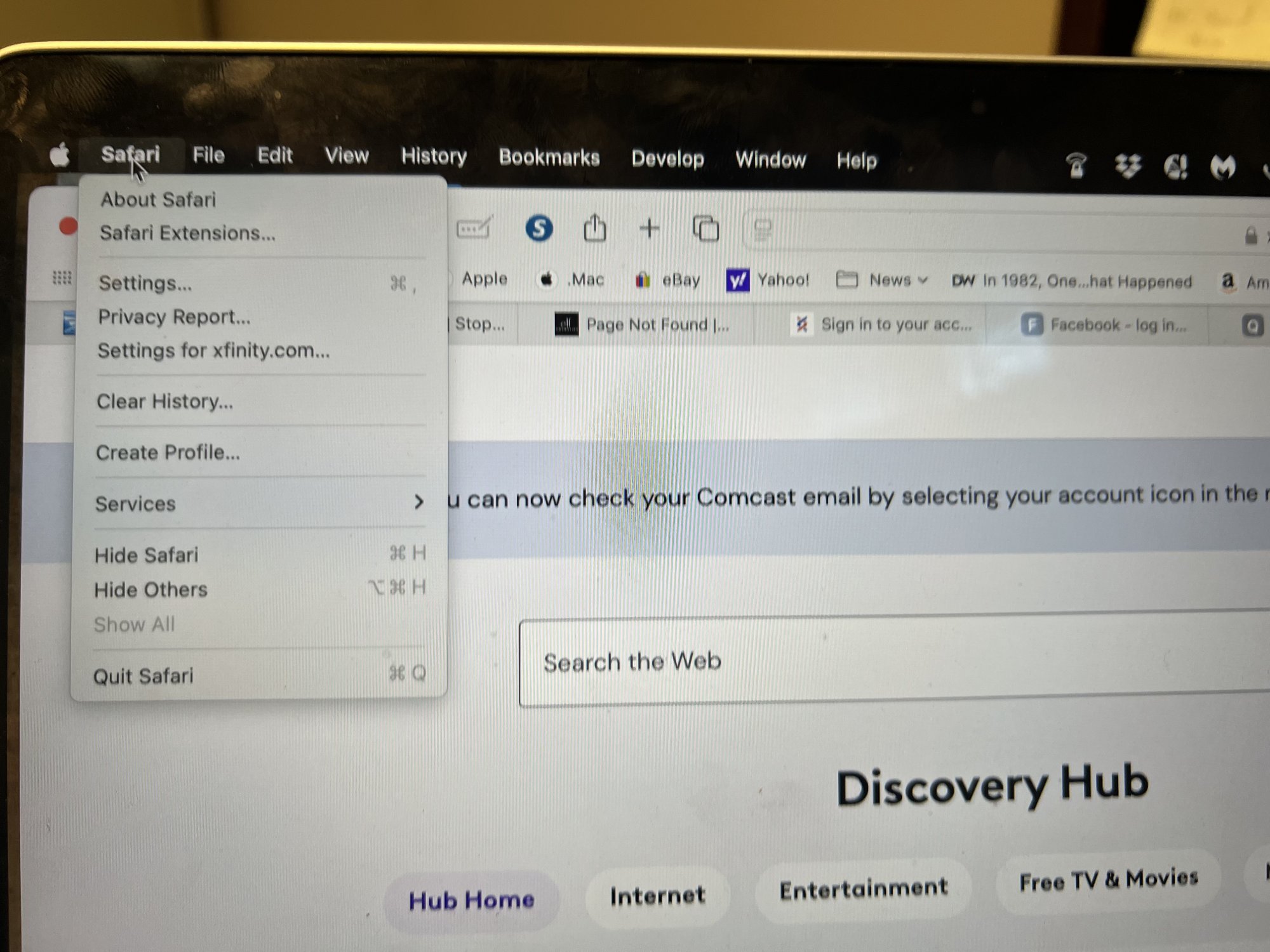 Having a problem logging on to any website. Doubt it is my WiFi since my husband's MacBook Air is working fine. I tried to reboot it... didn't help. Tried clearing all history... it didn't help. I wanted to clear the cache but when I clicked on the Safari tab..... the Preference Tab is missing. How do I get it back? I am pretty much computer illiterate. So I need simple instruction. Thank in advance.