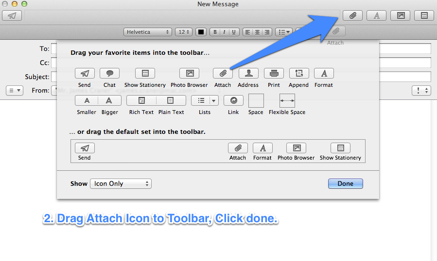 Drag the Attach Icon to the Toolbar. Click Done.