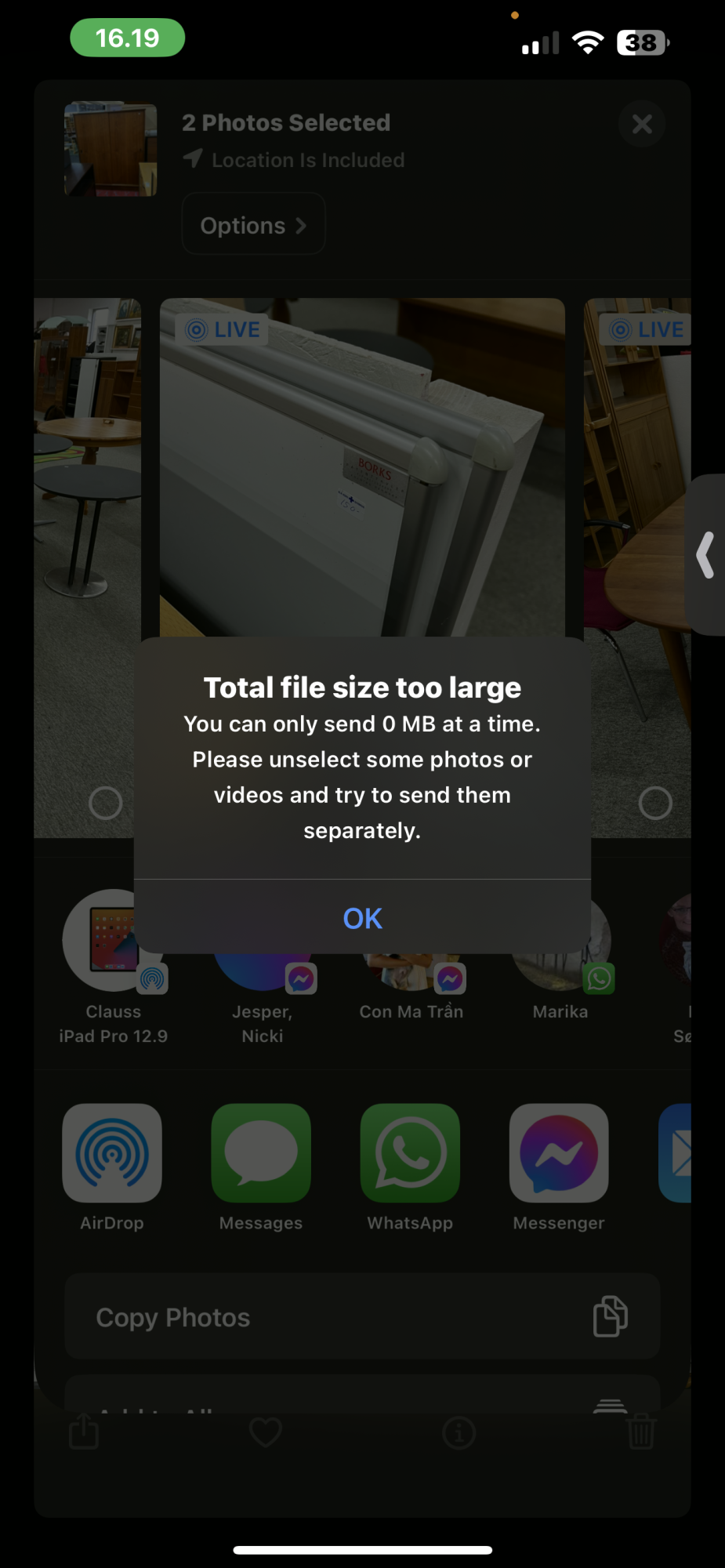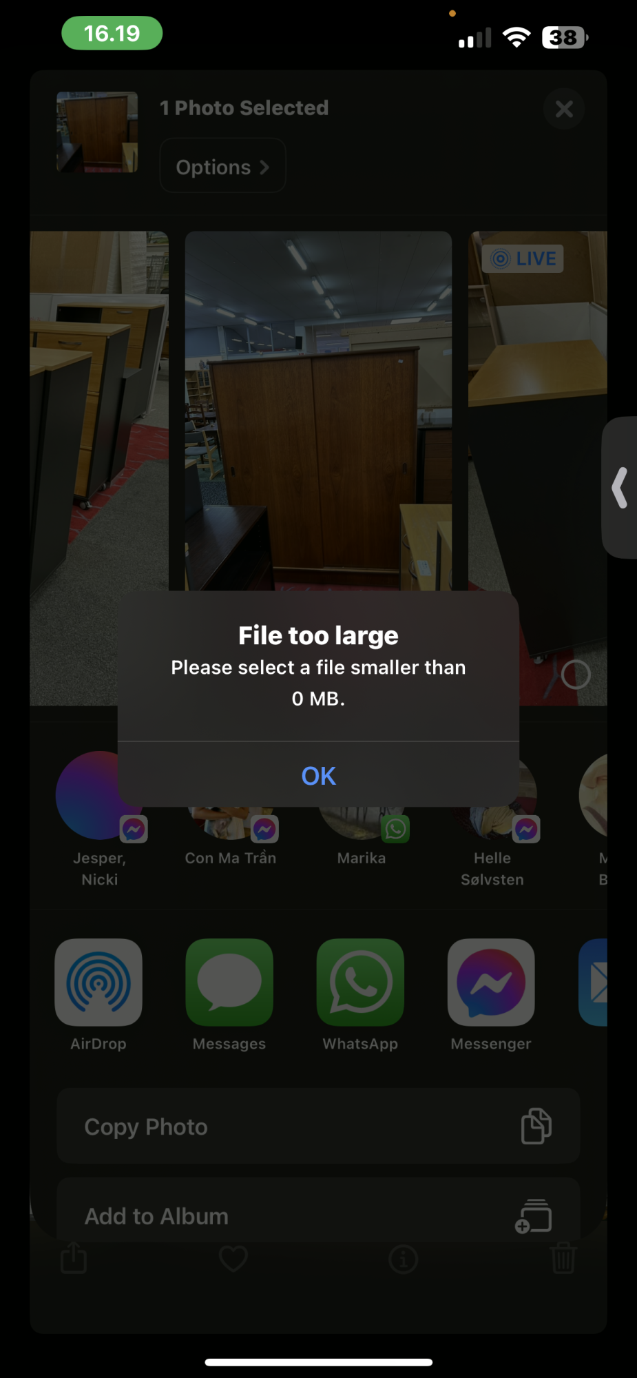 As Claire51 said " I have discovered that I can send pictures directly from messenger but can’t select them from photos to send."I have spent all day trying to resolve this problem... (not very tech minded) but been searching for solutions and nothing has worked. This is the only forum I have seen that even mentions the error message (as illustrated by Silver 78) that I keep getting when trying to send photos from photo library or screenshots via facebook messenger today. My iphone is still on IOS 16.7.2 which states is up to date. I contacted Apple they said I needed to contact the App developer.. facebook. I have been unsuccessful in finding anywhere I can actually contact them. So are you all saying we have to wait as there is a bug somewhere and is that with Apple or Messenger?