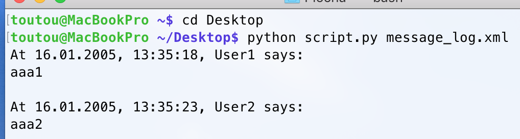 then hit return (enter).Code:python script.py chat_log.xml