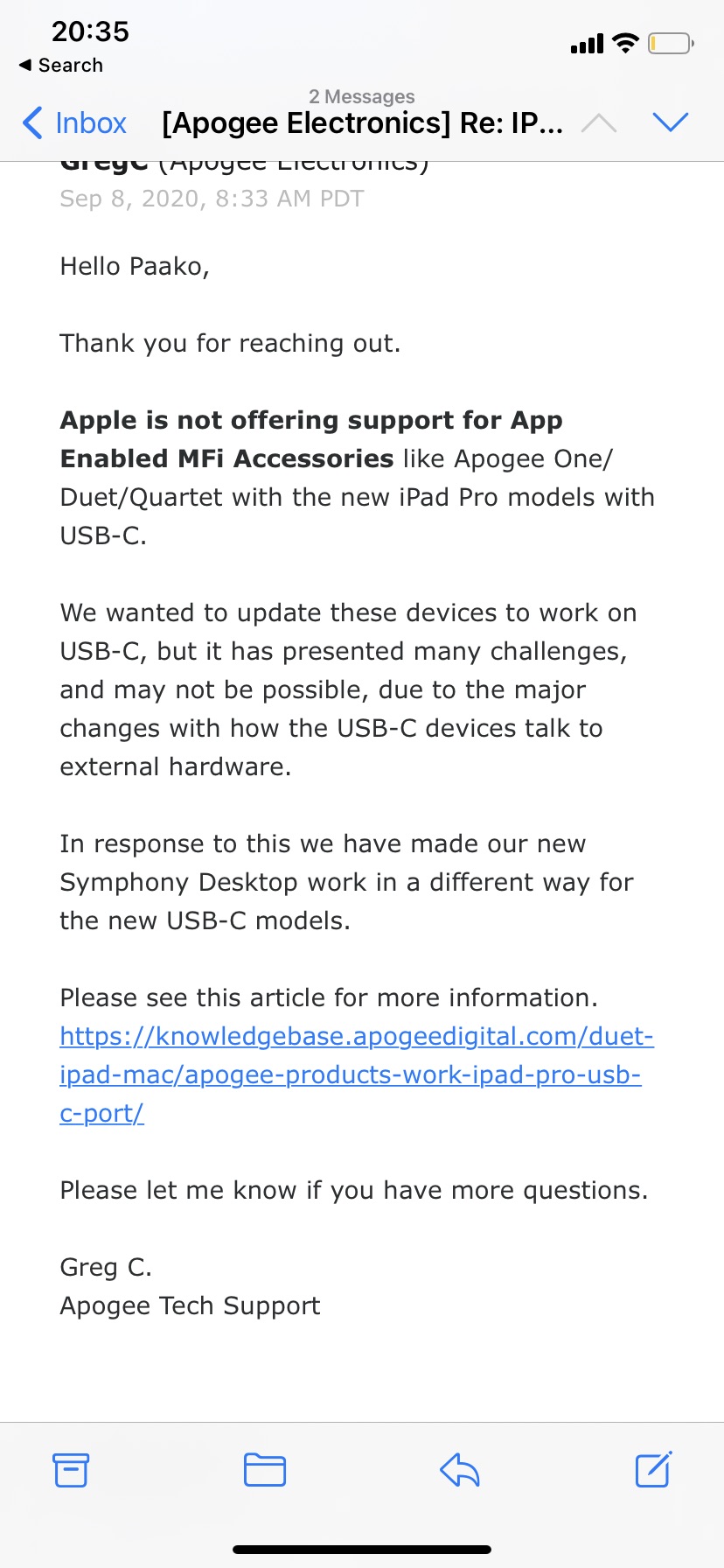 Wow, that's a blow. Aside from being $1k more than the ONE (with a lot of cool features I'd never use anyway), the Symphony is a different class of device. WAY more inputs and outputs. I don't want to invest in another interface period right now, but at least update the ONE to support USB-C iOS devices.