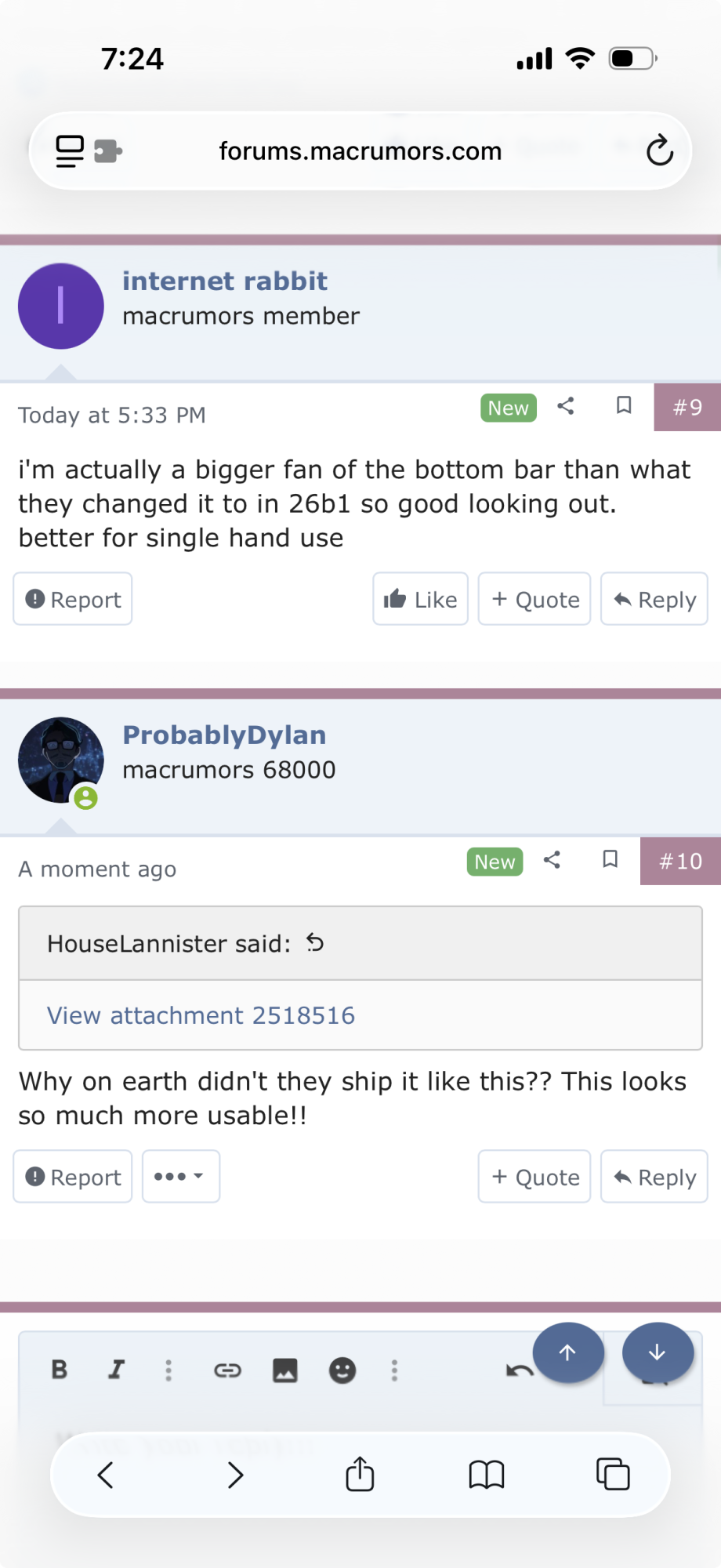 A lot of Liquid Glass elements (aside from the texture) boil down to just making every UI element simultaneously take up more space while also having less room for content. It's such an unfortunate "trend" with recent UI where designers believe they must make as much of our screens as useless as possible.Agree, it also feels unnecessarily tight with the address/tab bar squeezed in the middle which for many sites doesn't even fit the name, there's loads of empty space to the left of the back button and right of the more button which is just empty.