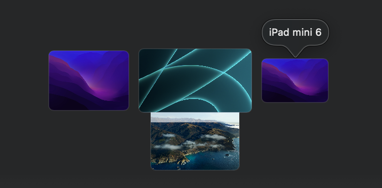 At the bottom it is my MacBook Pro, connected to an external 27 inch 4K monitor via USB-C on top, then the iPad Pro on the left and the iPad mini on the right. Interesting that I had to move the cursor up to the external display first, then move left or right to push the cursor into the iPads. I can't drag the iPads down to the sides of the MacBook Pro in the Display settings as shown above.
