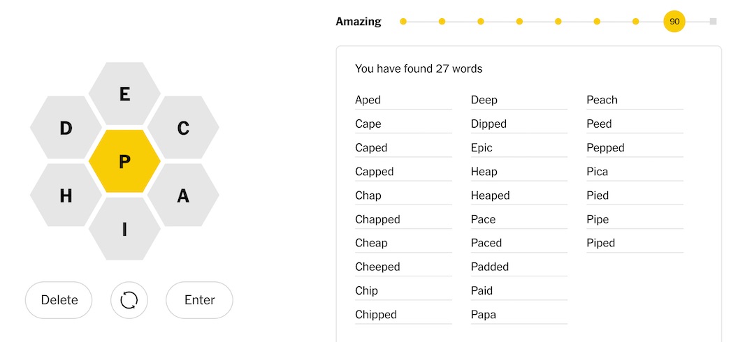 I don't spend as much time on crossword puzzles as I used to do when riding the trains to work, but I like that Spelling Bee puzzle in the NYT online - they give you seven letters with one being required and you make as many words as you can think of. Answers go up the next day so you can roll eyes at what you missed. It's good for a coffee break. Annoying sometimes when you find a word they seem to have omitted for no good reason.