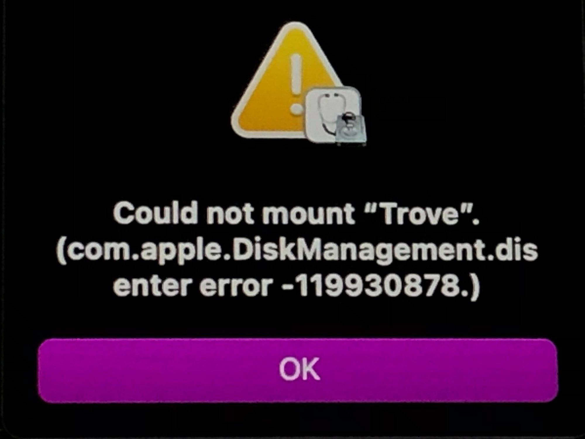 Flash forward to me using the drive for the next time, earlier this evening. I plug it in and... it didn't mount. Start sweating a bit. Open Disk Utility and it shows that the main (and only) volume on the disk is not mounted. Click "Mount" and get the following error (excuse me taking a phone photo of my screen and not a proper screenshot):