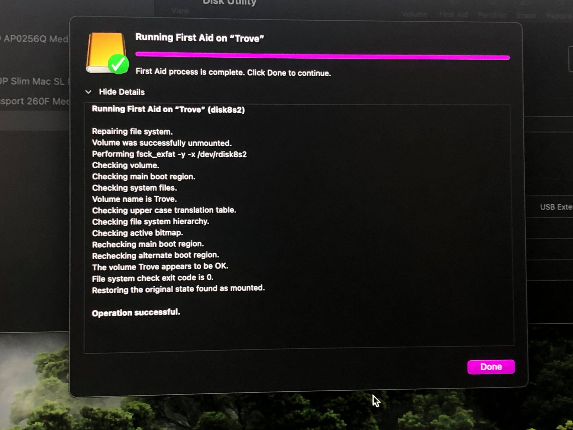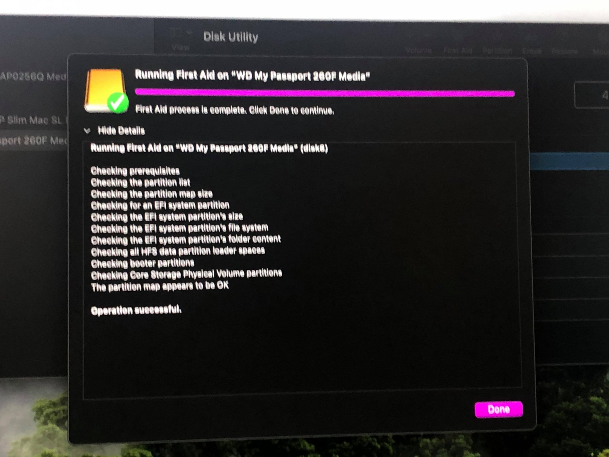 I have a backup of this drive, but I decided to run First Aid in Disk Utility at the volume level and then the disk level (the order recommended by Apple) out of an abundance of caution. Here are the blow-by-blows for the two First Aid runs (again, excuse the phone photos instead of screenshots):