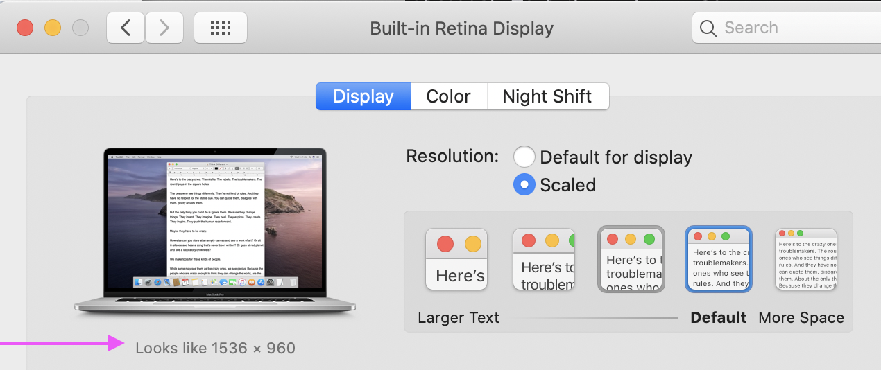 Apple states that the real resolution is 3072 x 1920 and according to Apple the supported scaled resolutions are: