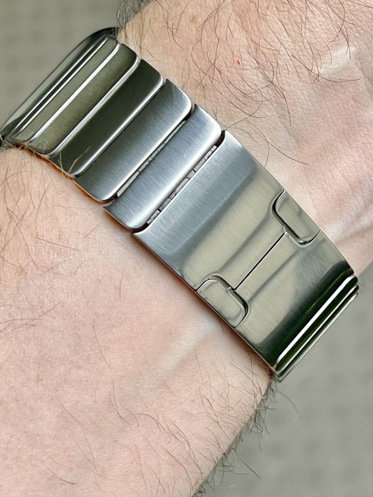 And here's a stainless steel link band that I bought in 2015. I would love to see a seven-year-old space grey (or black or whatever they call it) stainless steel link band that looks this good after seven years of use. The silver band is easier to scratch, but it's the only one that can be restored to perfect condition in less than five minutes, using a pen eraser and a polishing cloth.