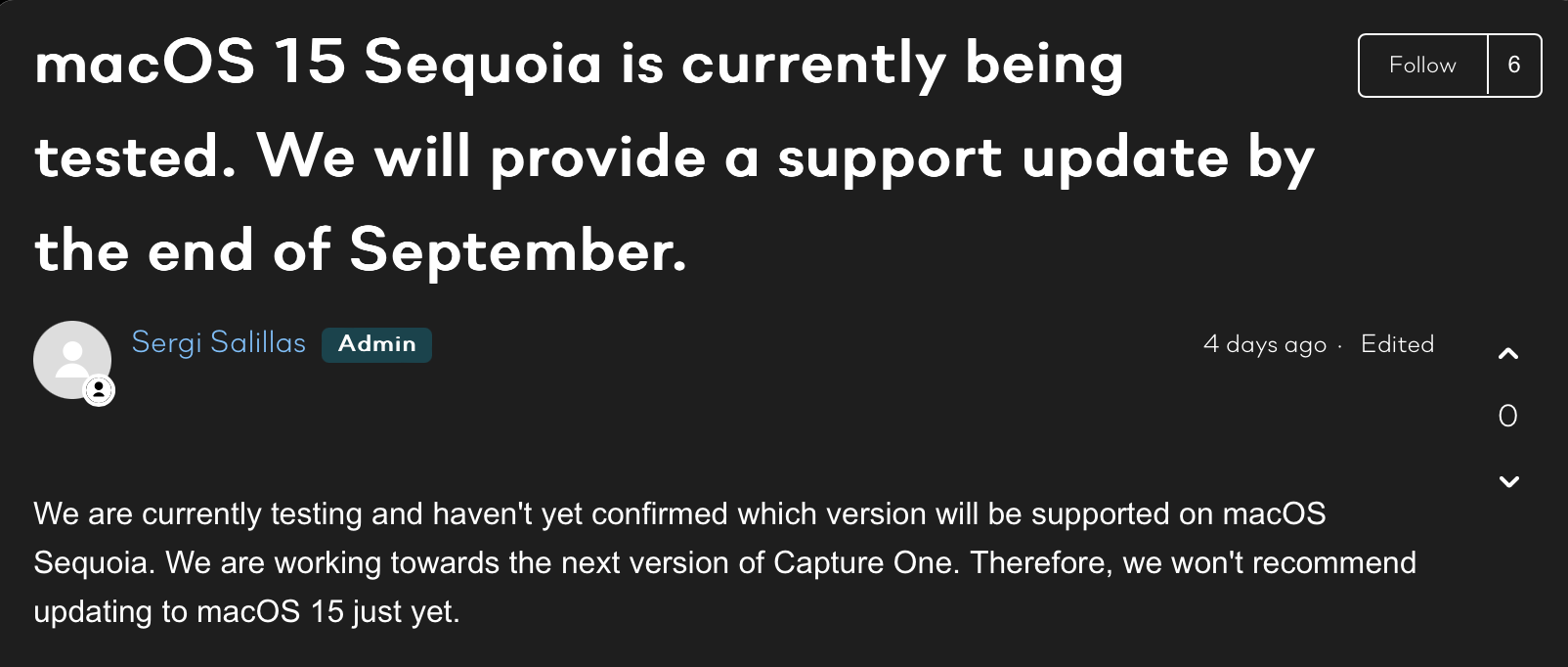 Would love to hear from those using Capture One who have upgraded to Sequoia and what iteration/ version you have (pls include in the reply), perpetual or subscription (shouldn't matter with the current business model).