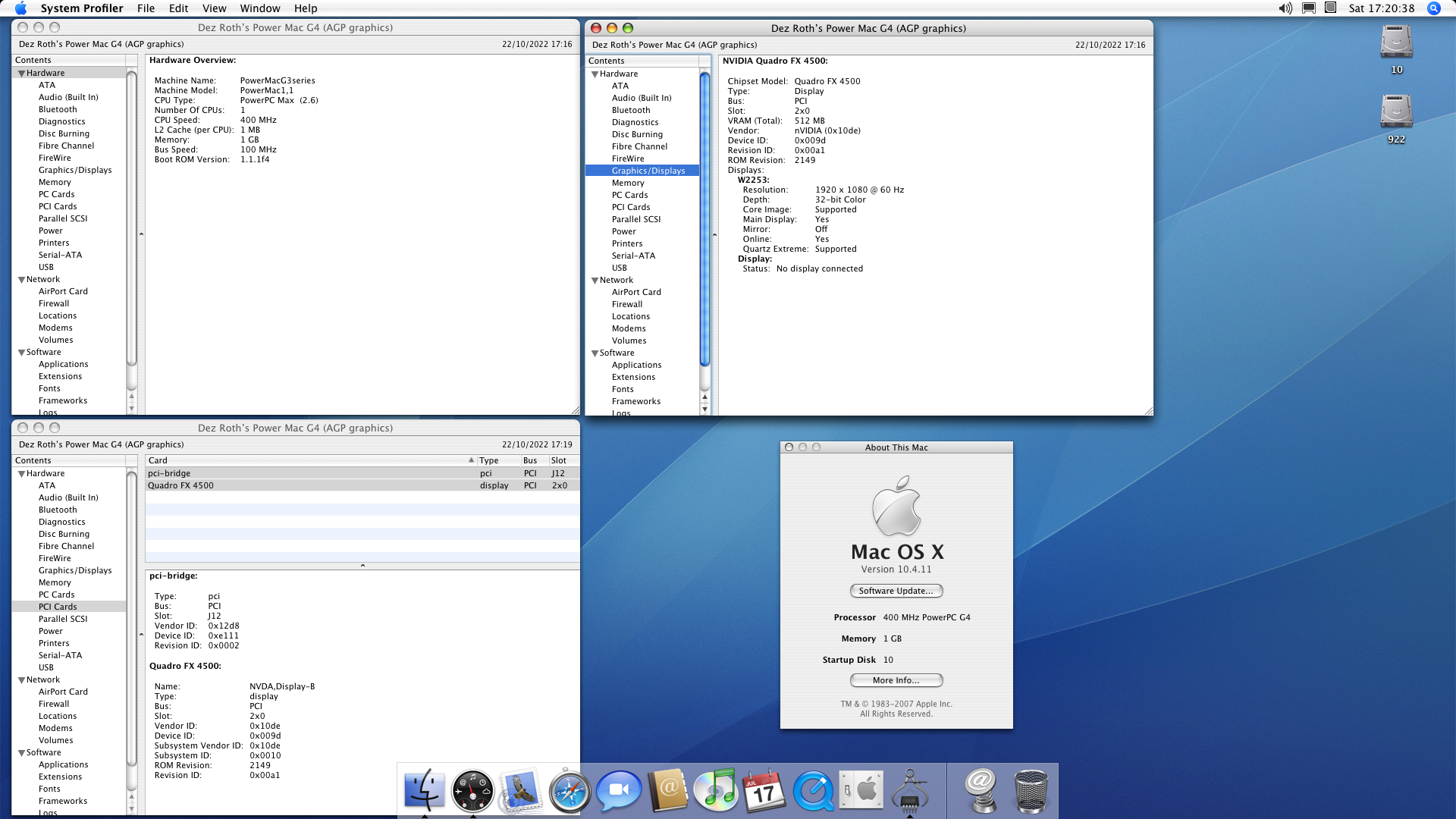 I booted into Mac OS X 10.4.11 and did some OpenMark benchmarks (see attached). A Quad G5 has score 9331 for 1920x1080 while the B&W G4 has a score of 7372 and the Radeon 9200 is 1179.