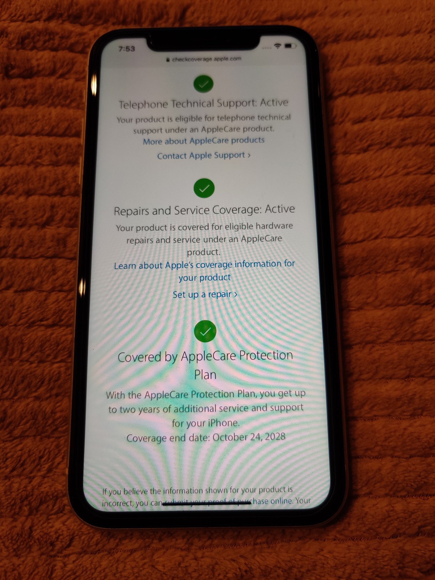 We had purchased a used iPhone XR from Facebook Marketplace in mint condition. There are no problems with the phone, but had noticed in Settings...General...About an extended warranty through 10/24/2028. I included a screen shot from the phone and from the Apple serial number lookup support site. I had no idea you could even get a warranty that far in the future.