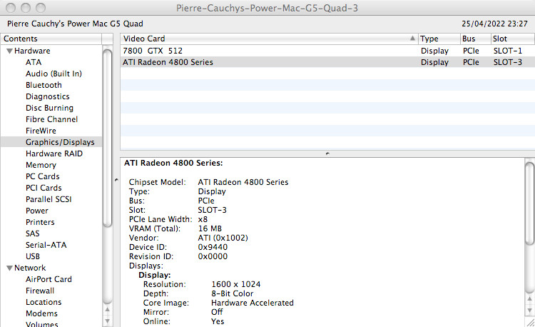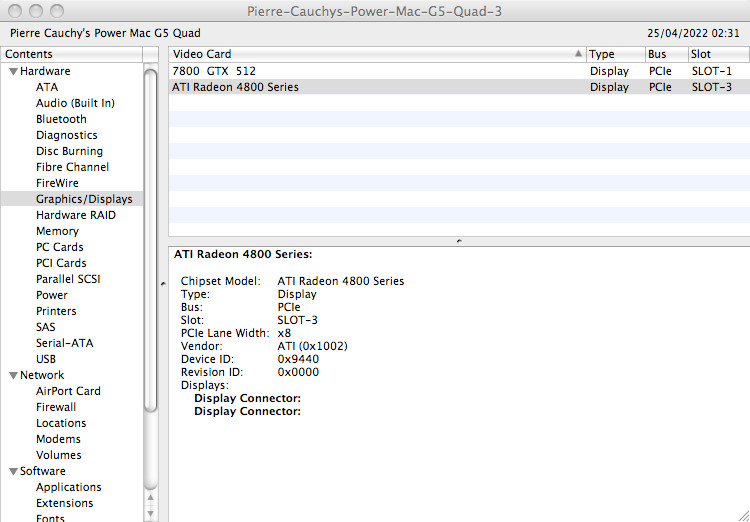 Both my stock PCIe Radeon HD 4650 and 4870 (PC versions) cards do get recognised under 10.5.8 ppc, with display nubs created, however so far only with a black screen. Their fans, which normally rev up slightly as linux loads (under which they work flawlessly) as activity increases, do not rev up at all. Adding EDIDs to Info.plist (either as base64 or hex) does seem to go slightly further in that displays are shown as connected to the cards, but only in debug mode. The amount of VRAM seems wrong though both using the 4650 (512Mb) or 4870 (1Gb). Both cards are supported as per knownCardList.txt and rhd_id.c. The second last System Profiler screenshot with the 4800 series (actually HD4870) shows what happens when debugMode is set to false. Same result with the HD4650. The display nubs are there, but with nothing seemingly attached to them. The very last System Profiler screenshot is using my HD5770, which, although being detected as display, clearly doesn't seem supported.
