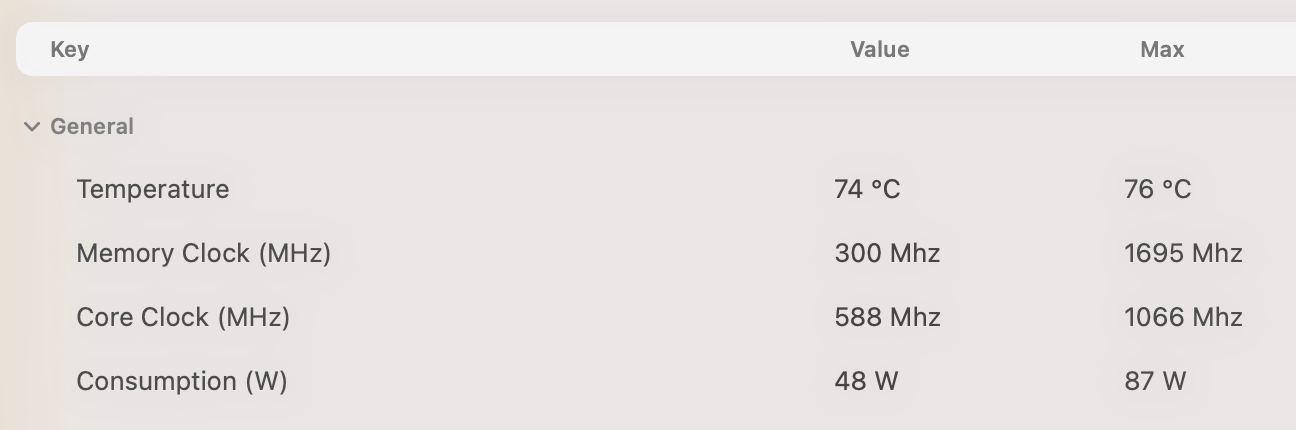 I attach a snap of main GPU details idling vs geekbench5 test taken with GPU monitor app.