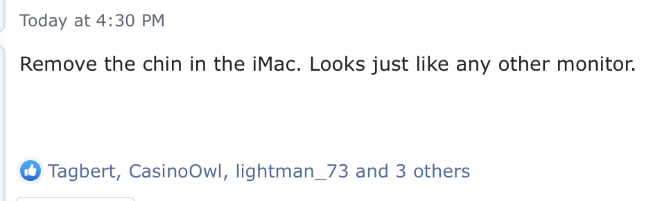 And exactly this Apple wanted to avoid and has worked hard on it, and I'm glad about this design every day.Just make the iMac as thick as the studio display. Problem solved.The Studio display basically could have been an iMac to start with…
