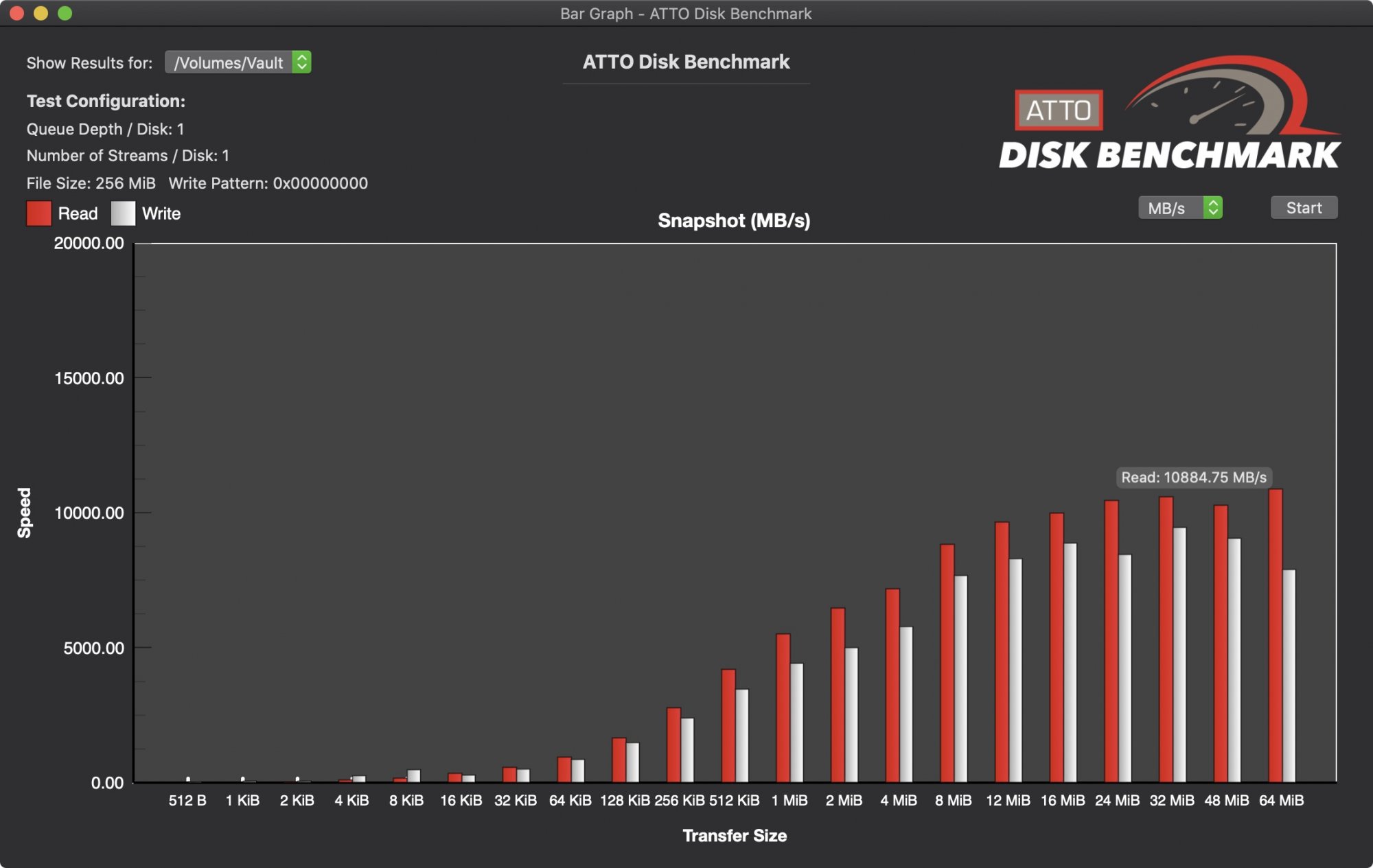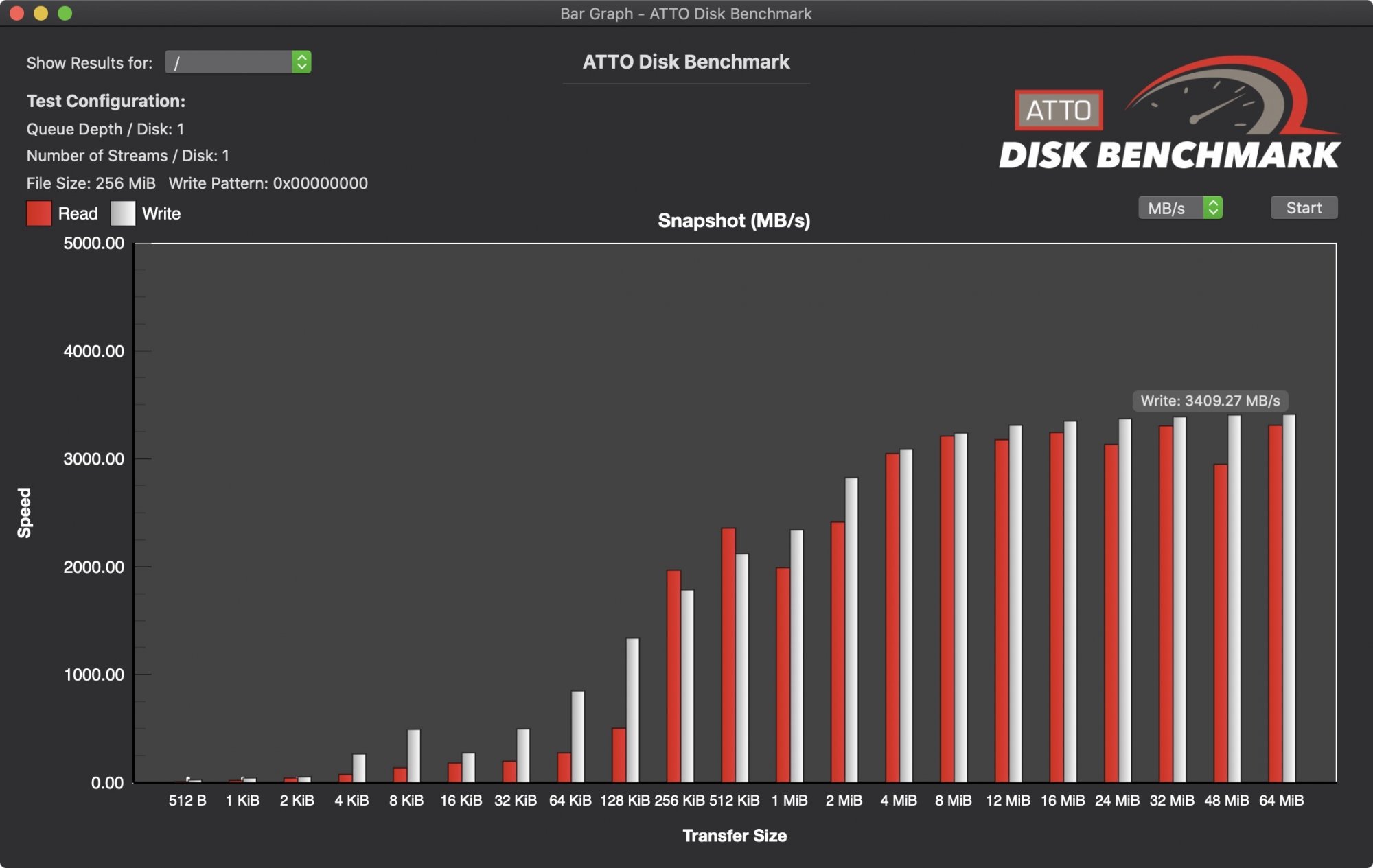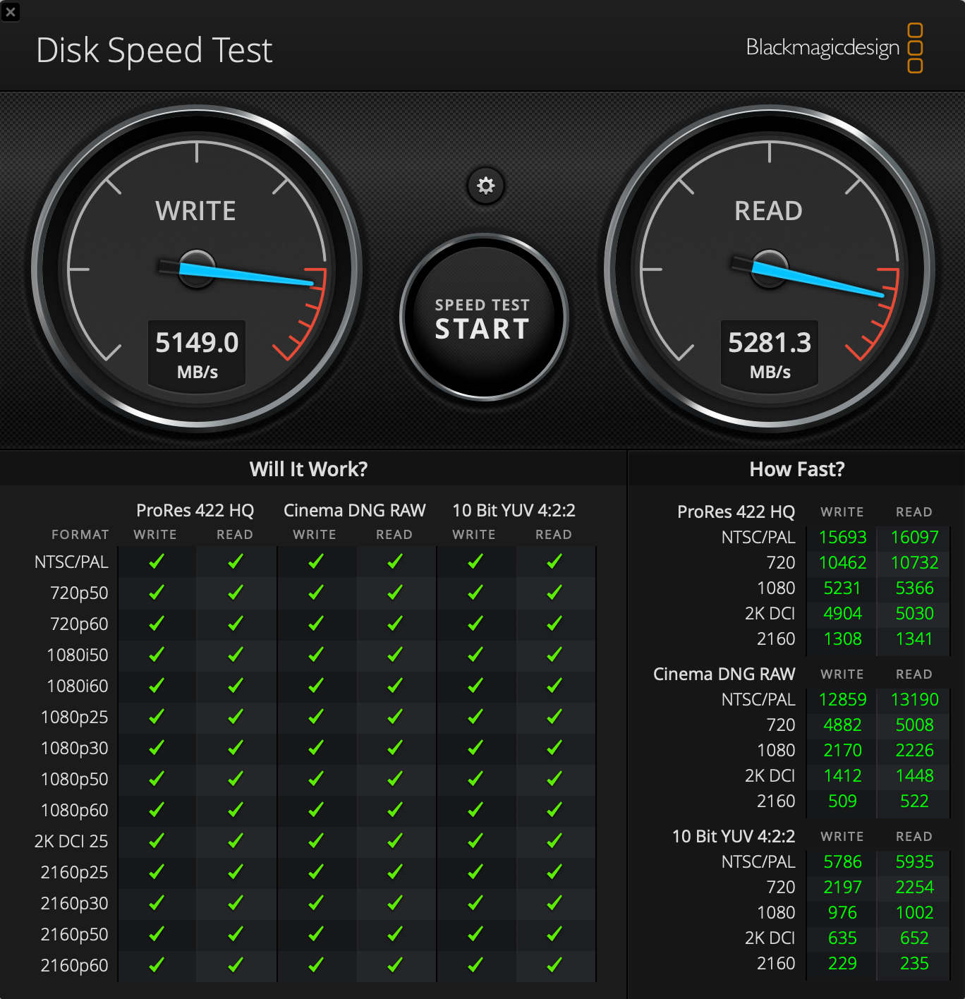 Here is a Black Magic Speed Test on one of the NVMe sticks before I configured them together as RAID 0 with Disk Utility (all four modules performed equally well):