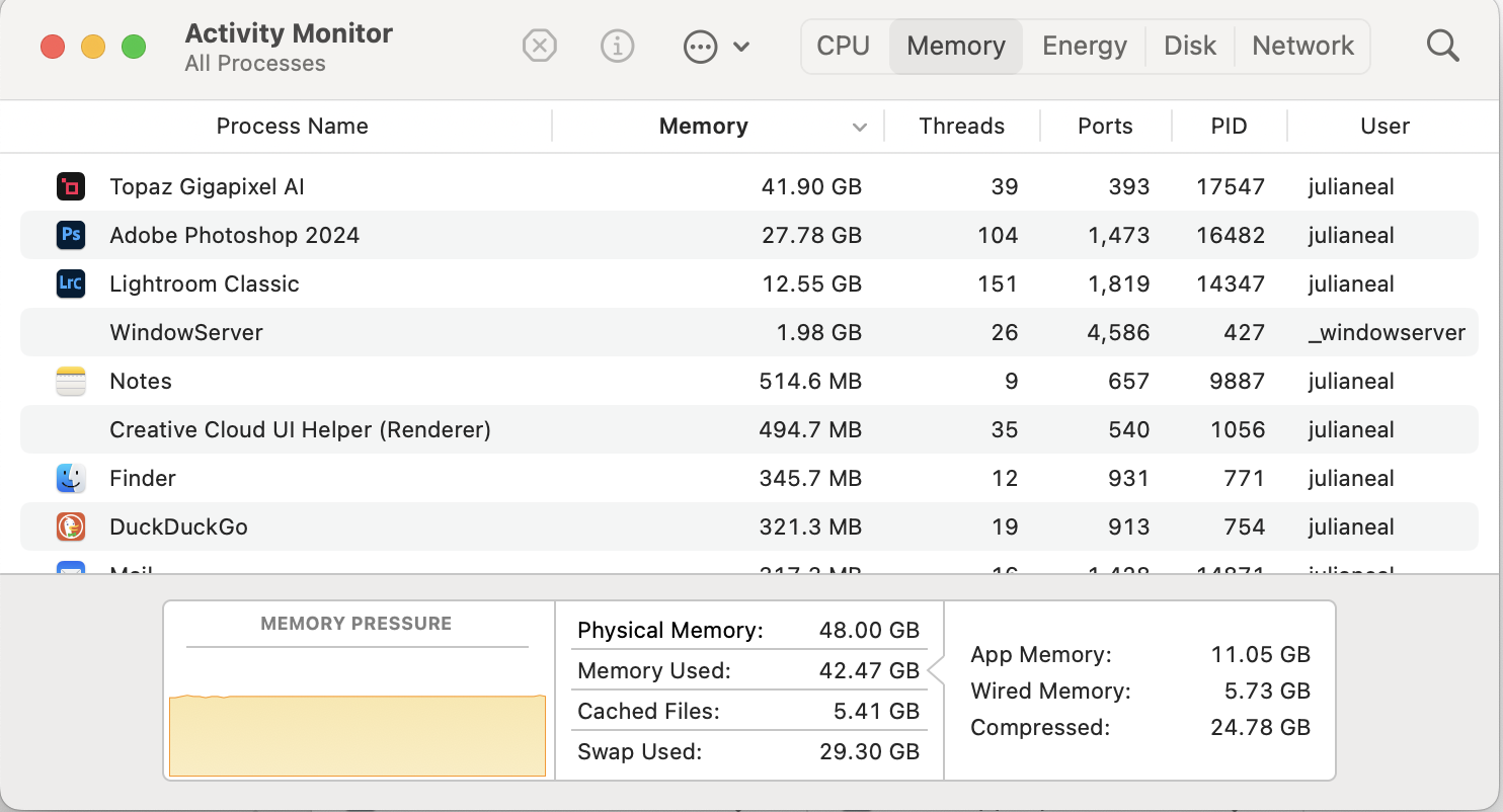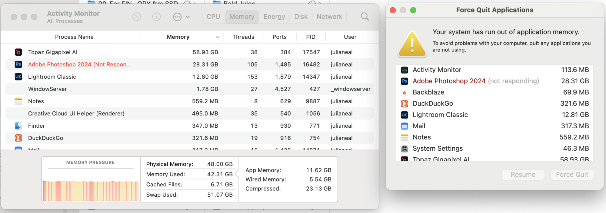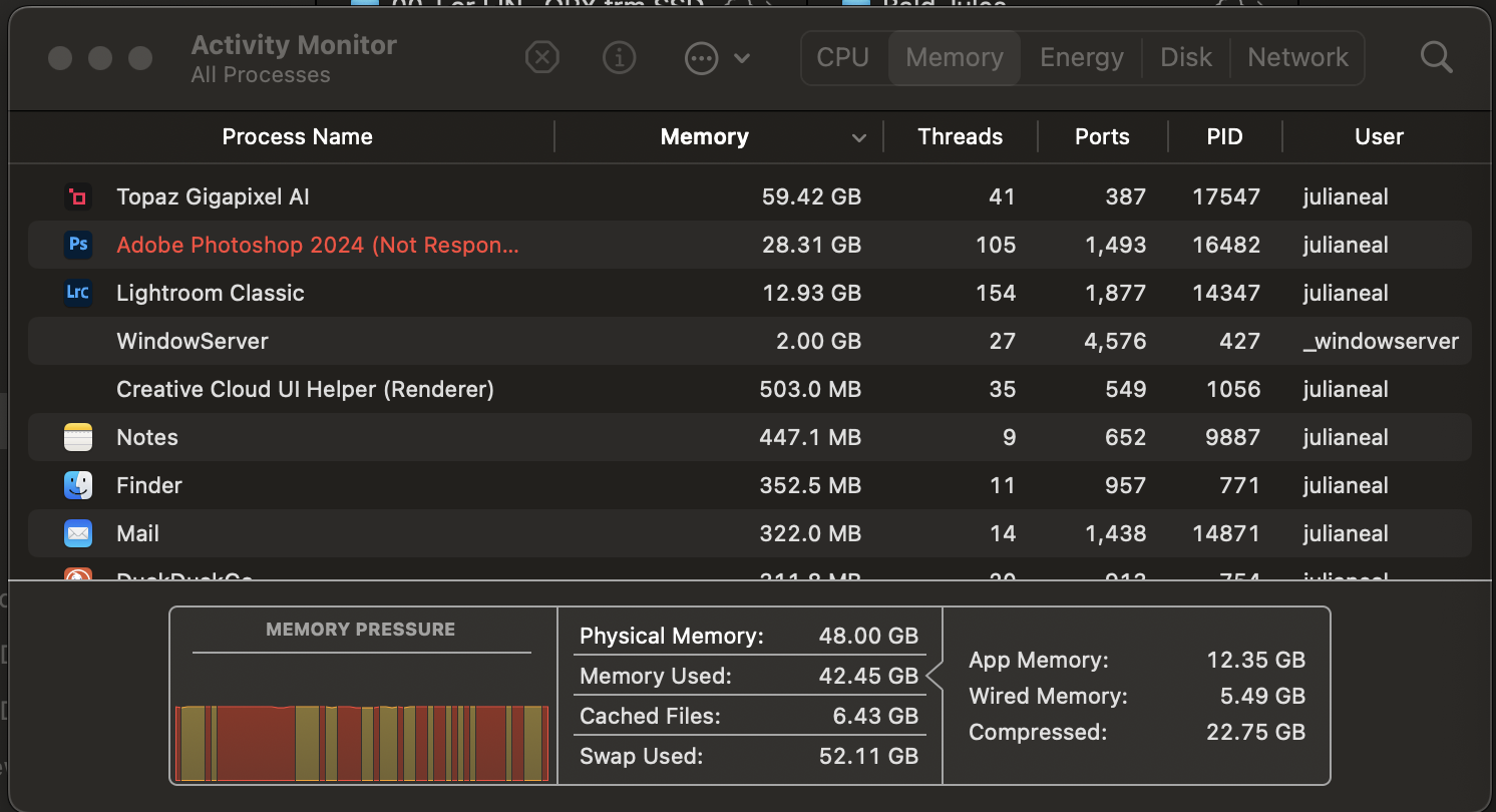 Applications / workflow: Adobe Lightroom Classic, Photoshop, Topaz usually all running together, sometimes with InDesign and/or large MS Powerpoint files open simultaneously, plus admin/research/comms tools: multiple browser tabs, Mail, Slack, VPN, password manager, Zotero, MS Word etc.). Each Adobe app required 5GB RAM to itself.