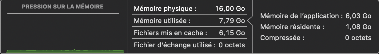 So far I have established that at a typical time when I am working (Safari with twelve tabs open, one VMWare Horizon session, Microsoft Teams, Microsoft Outlook, Apple Mail, Apple Music) I get the following memory stats from iSTAT: