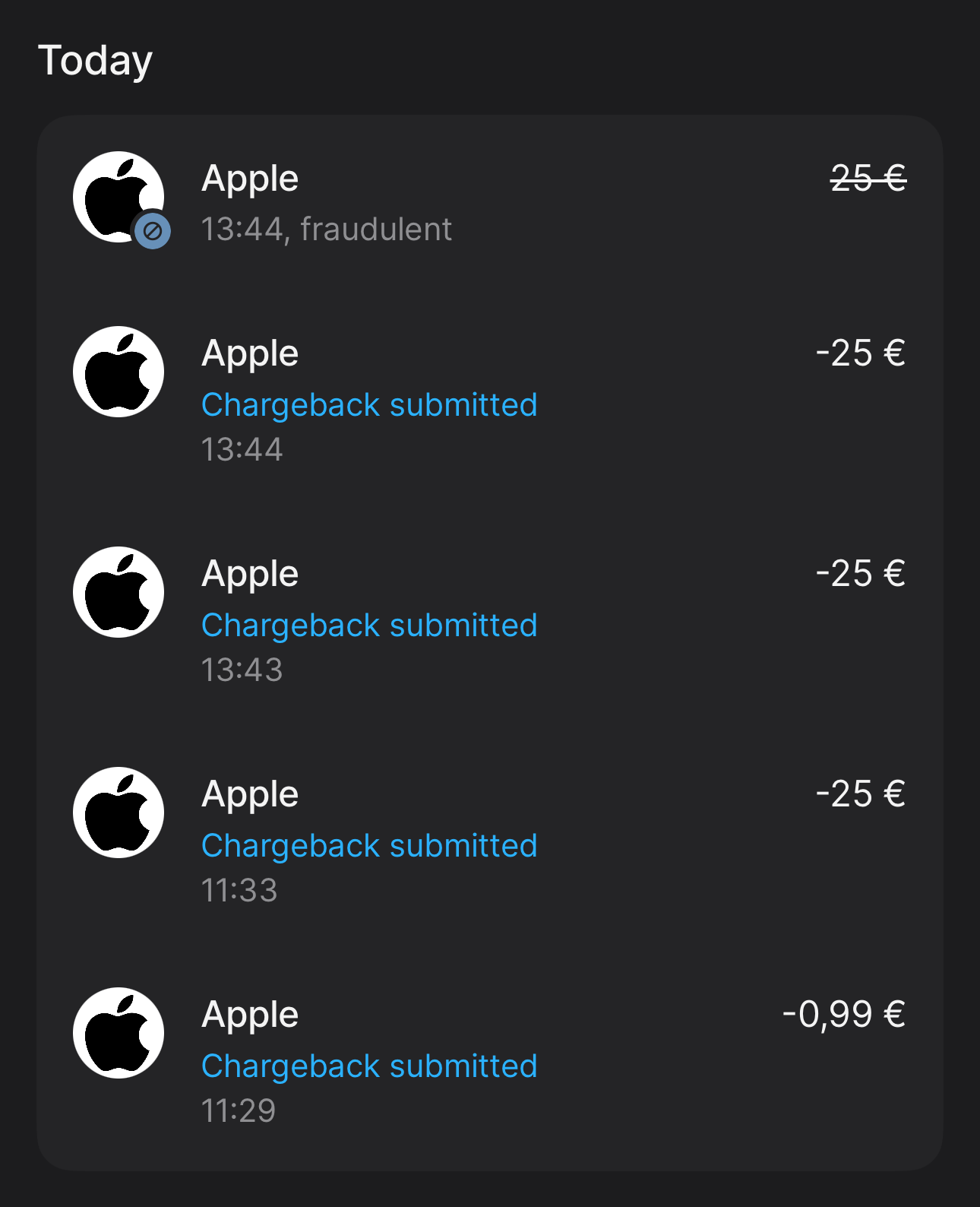 Interesting. It's not in the Apple transaction log? Is it possible for someone to spoof a transaction logo/name, similar to how emails can appear to come from Amazon or Citibank?Just had this happen to me with my Revolut card associated with Apple Pay. Multiple payments of 25 euros went through before Revolut blocked transaction. I am from Lithuania. No transactions shows up in apple transactions history.