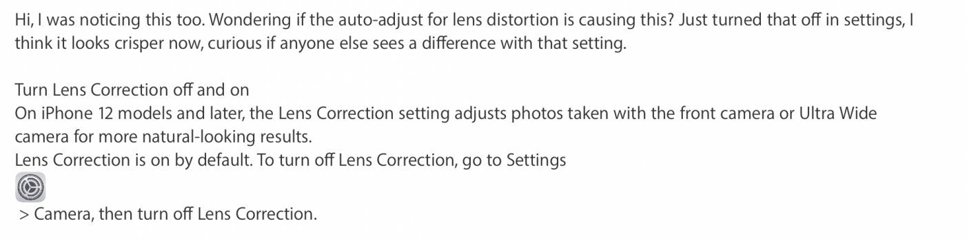 This only applies to the front and ultra wide cameras, not the wide that we all use 90% of the time. I doubt this will do anything for the photo quality we’ve all been discussing here.I've been dealing with similar issues on an iPhone 13 and 13 Pro. Discovered this setting a few hours ago and turned it off. Seems like pictures are a bit clearer but will test it out completely over the next few days.