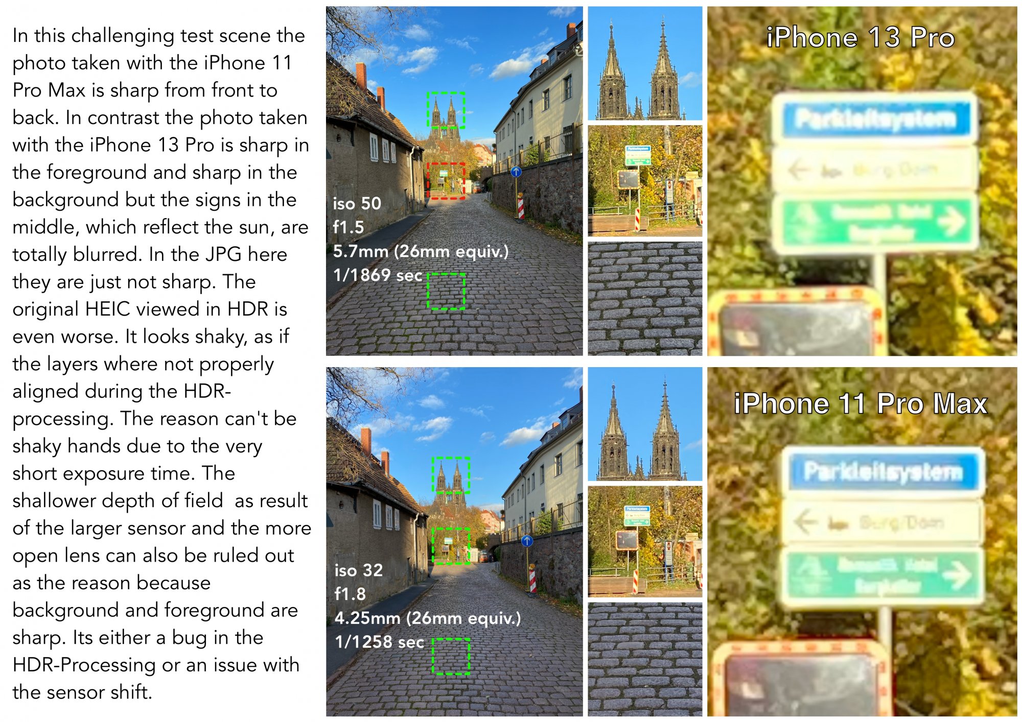 Little more ghosting on arrow and square signs for 13 pro - maybe less sharpness radius because of ƒ/1.5 ?