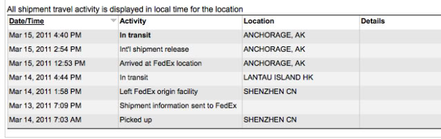 2011-03-14 20:45:00 Left FedEx Origin Location SHENZHEN,