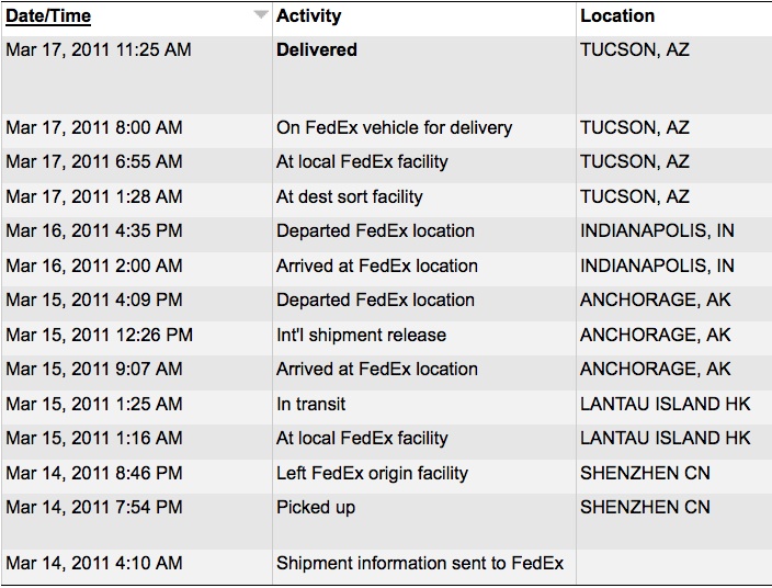 2011-03-15 14:43:00 Left FedEx Origin Location SHENZHEN,