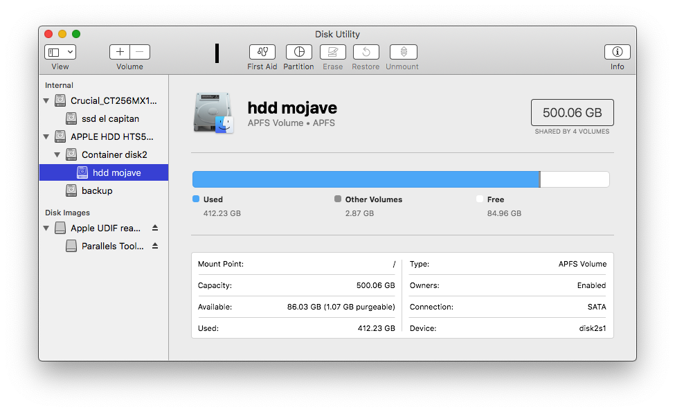 Booting from the HDD shows the system is in a container disk. The system on the HDD is Mojave, and the system on the good SSD is El Capitan.
