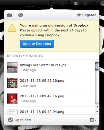 post 71. Czo has created a version of Dropbox that directly fakes version information to fool Dropbox. This makes modifying the SystemVersion.plist file unnecessary. Note that this makes the interface reflect the newer version and therefore you will have some icons that are clickable but do not function. To get to Preferences hold down OPTN when you click on the Dropbox icon in the menubar. All regular Dropbox functions are unaffected.