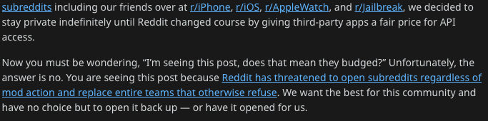 Anyway, as far as I can tell, the API change didn't have anything to do with apollo or 3rd party apps in the first place - it was because companies were training their AI models against posts people were making on reddit. Companies like Microsoft, who will make far more money off ChatGPT than Apollo did off their app lol. The fact that the idiot CEO has carved out exceptions for almost every other tool/app other than Apollo and Reddit is Fun .. kinda indicates this is more of a personal grudge than anything.