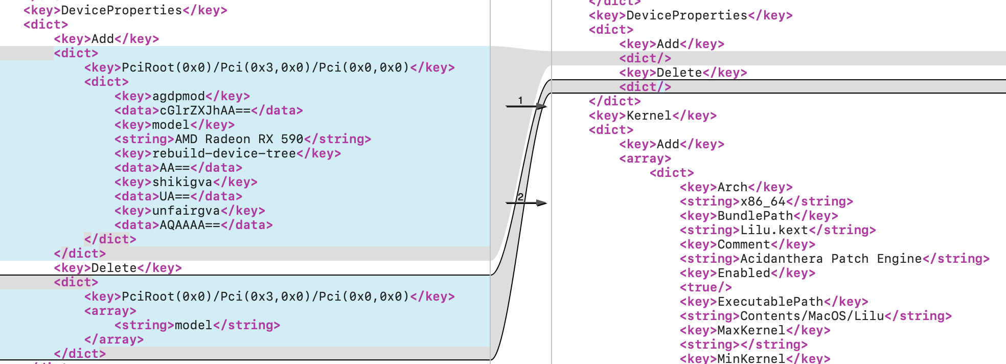 I have attached the two full config.plist files below in the hope that someone might identify what the problem is that is causing me to lose graphical outcome.