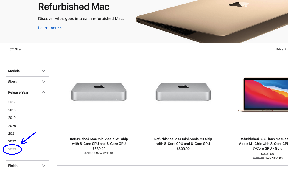 Are you looking at the U.S. site? If yes, try closing the "Models" filter option and opening the "Release Year" filter to see it.I don’t see a grayed out 2023 on the refurb site.