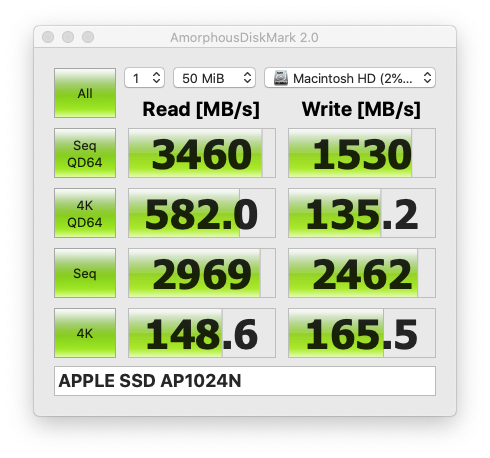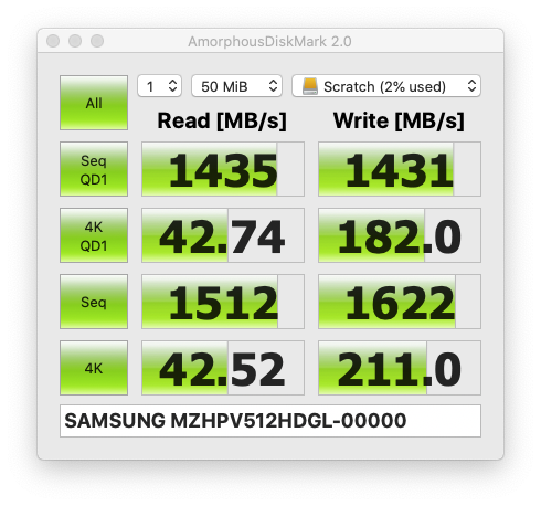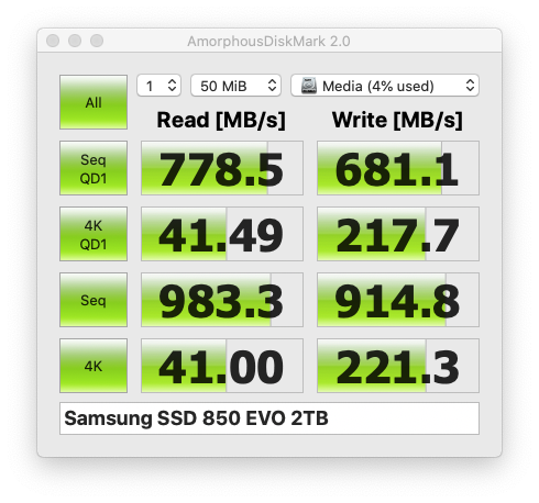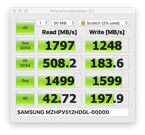Ran same tests on my late 2016 15" MBP13,3 with an Apple 256 GB Internal SSD