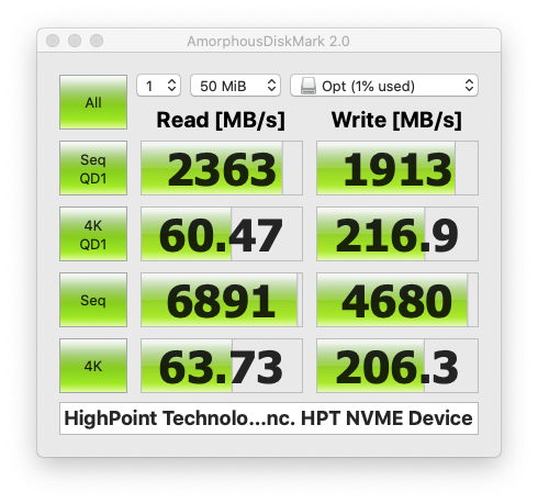Btw, a more meaningful test would be 4K transfers. NVMe total throughput is enormous and nothing beats it sequentially or with simultaneous IOPs, but most of the day to day transfers are 4K and it's parameter not much used for benchmark comparisons here.