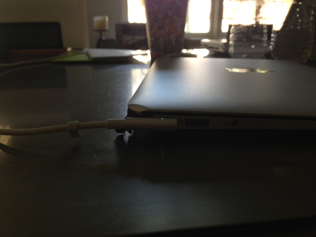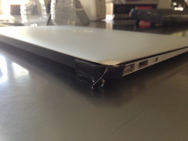 So as you can all see by the pics attached, I dropped my MBA and the corner of the top casing near the charger has bent. I had to tape up the bottom case to prevent the aluminum of the top case from grating away at it (I was getting smal aluminum flakes falling onto my screen etc).