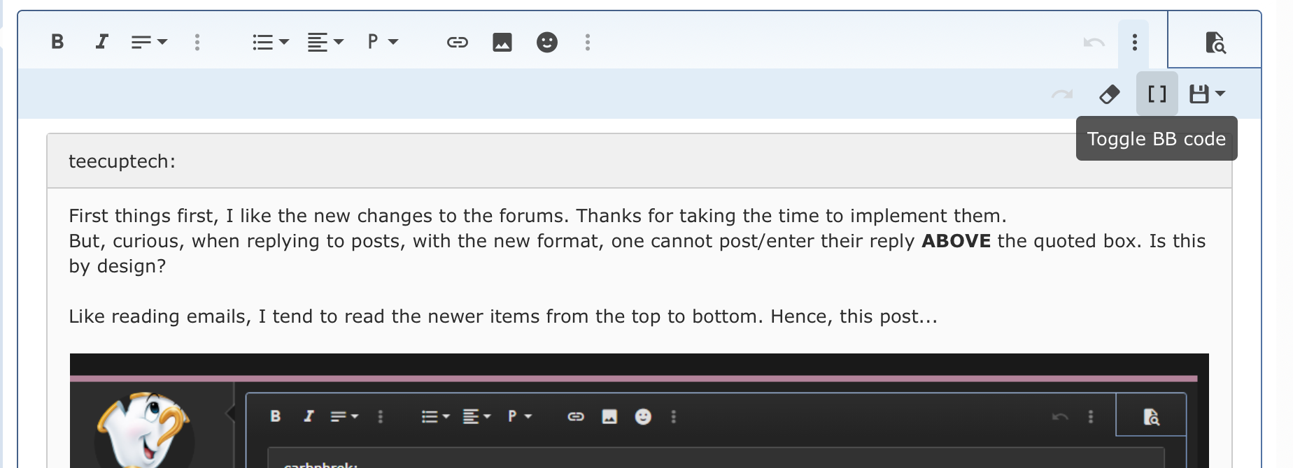 But, curious, when replying to posts, with the new format, one cannot post/enter their reply ABOVE the quoted box. Is this by design?