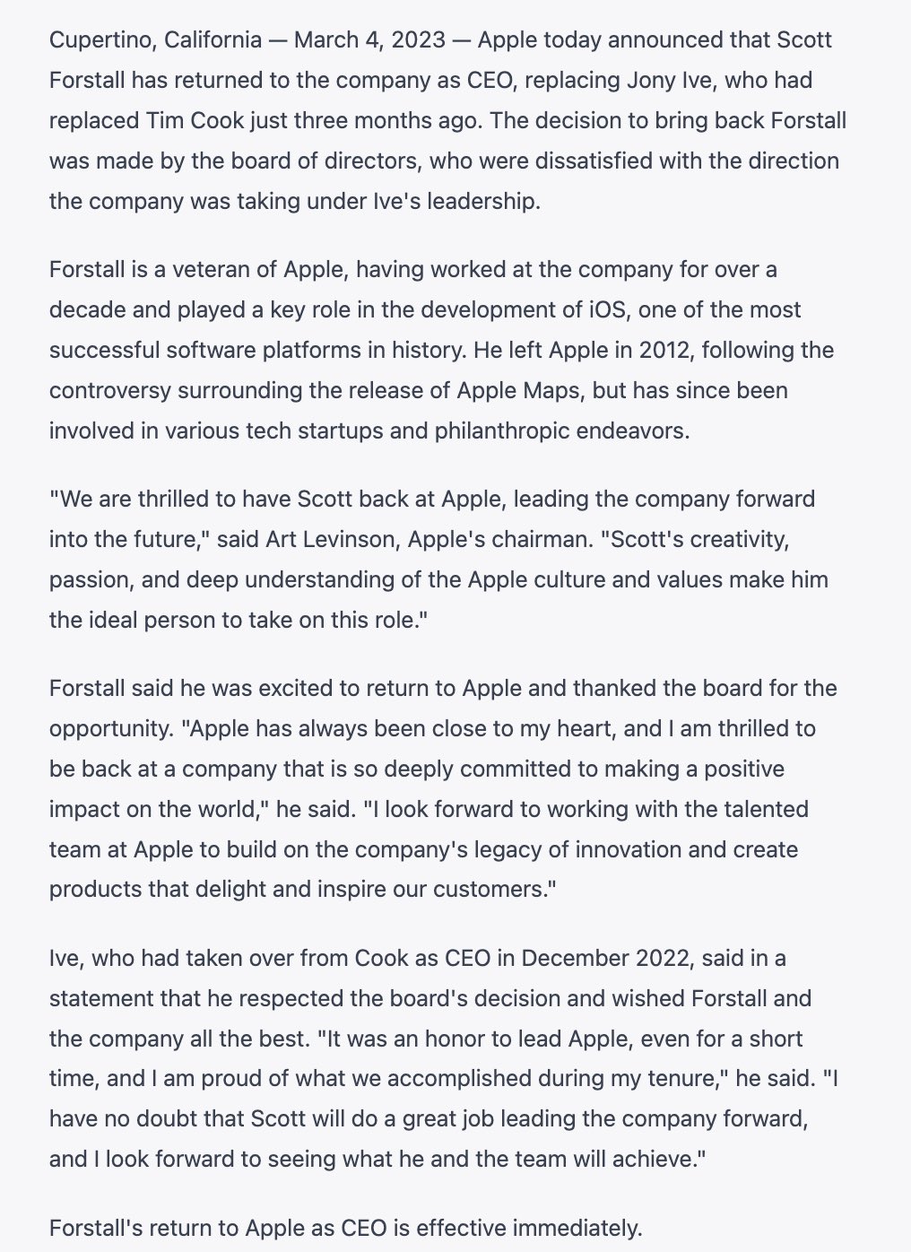 Apple should turn being late to this recent AI party to success by taking a long look how chatGPT etc are going to play out over the next 12 months. It is obvious that there will be more and more real and stupid concerns about AI, more issues, elation, and panic, plus the emerging governmental regulations and demands. By observing and learning from these developments, Apple can save themselves some trouble by developing a strong AI strategy that should be built around improving or optimizing their hardware for AI needs and acquiring the relevant AI talent/startups.